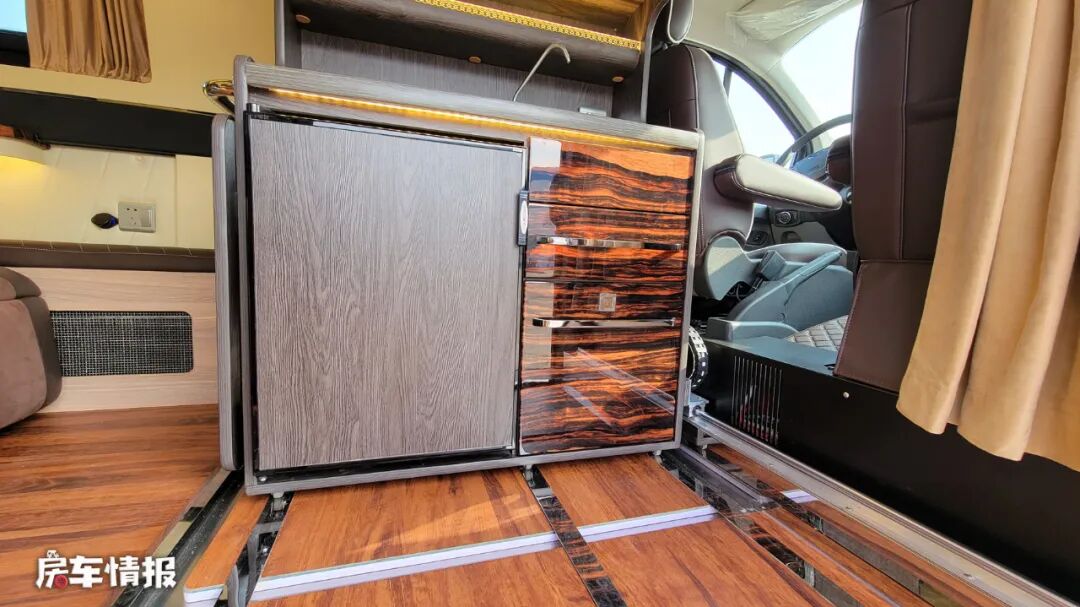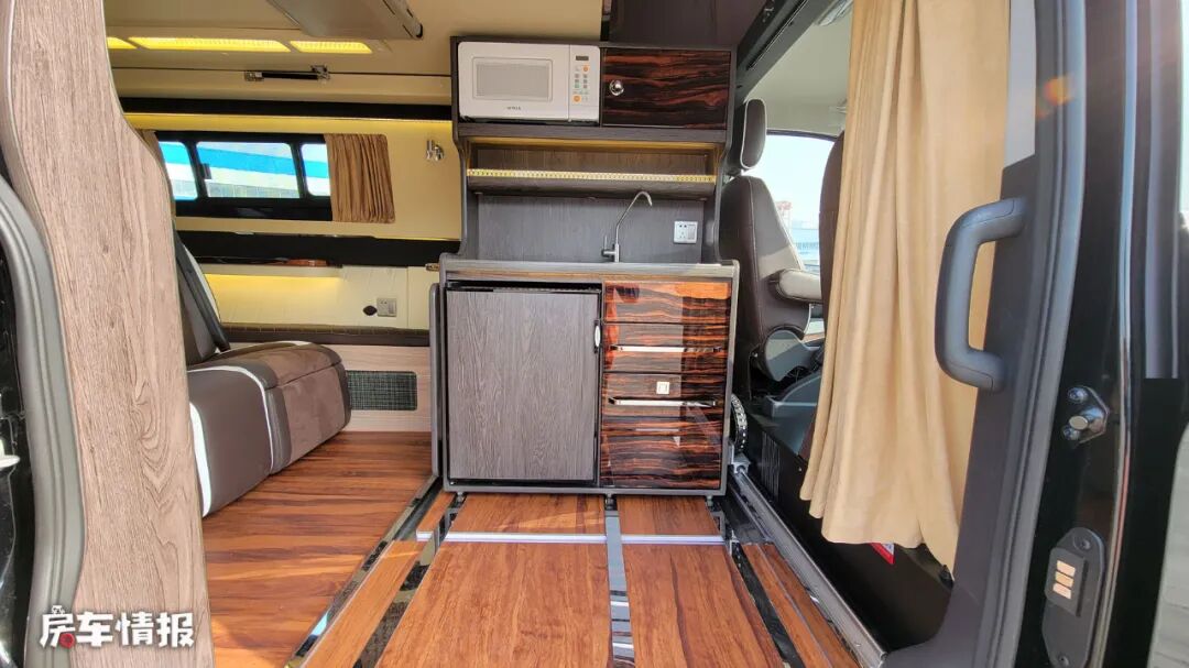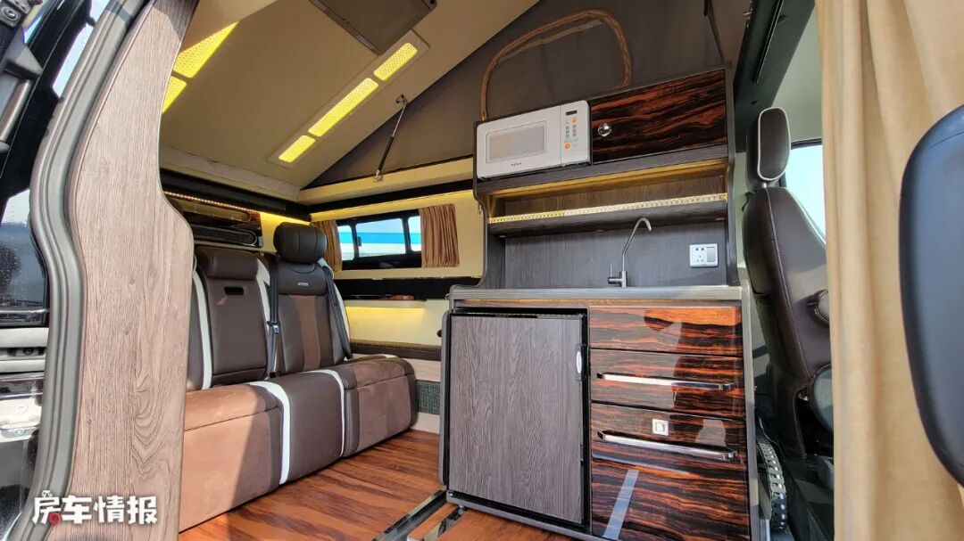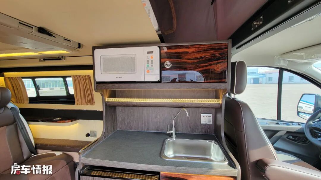 在主驾驶座椅后方是全车的厨房区,台面上带有基础的水槽,顶部提供了微波炉,下方嵌入了66L的车载冰箱,搭配便携式的卡式炉或者电磁炉,则可以满足基础的烹饪需求。