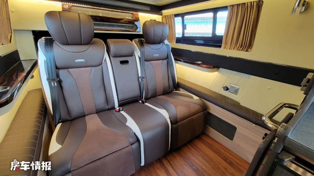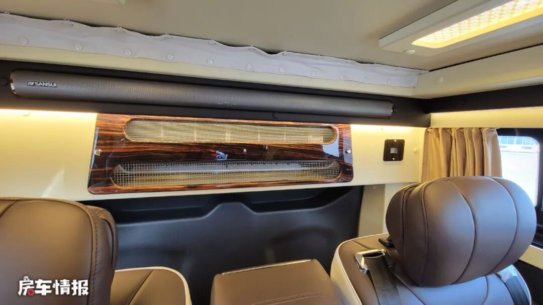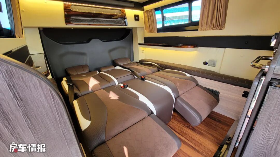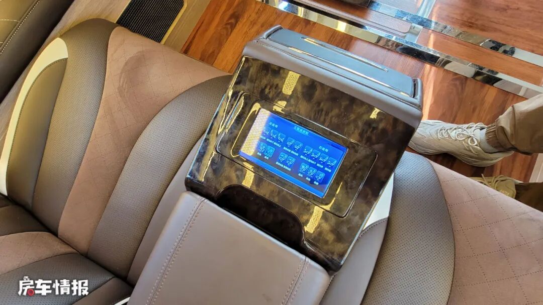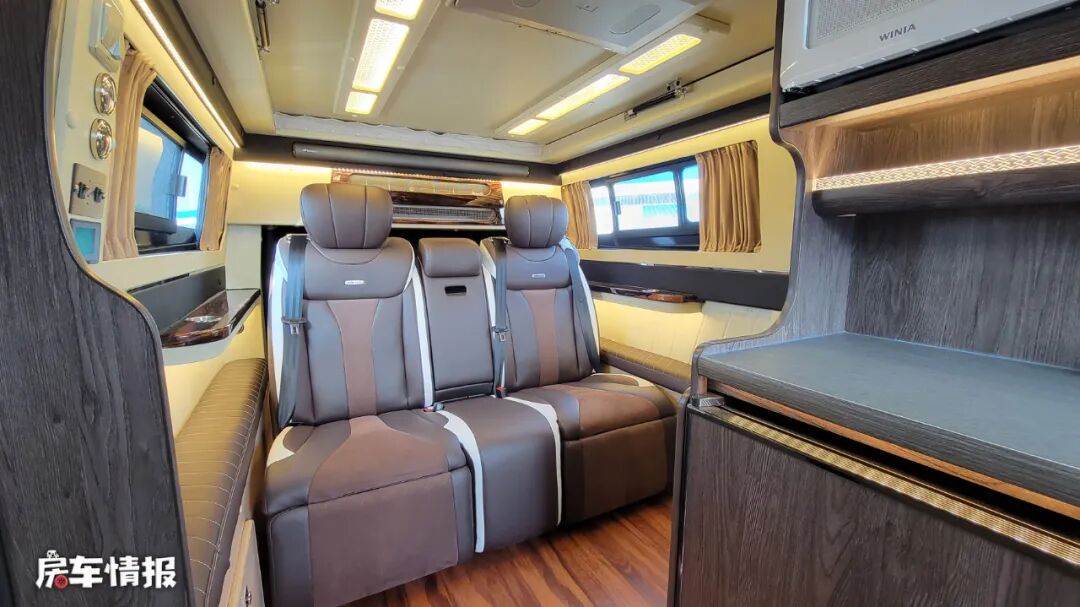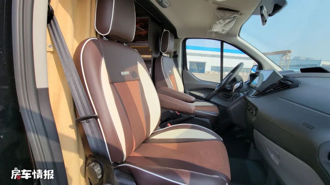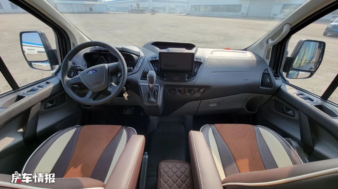 驾驶室内还是和我们以往看到的不太相同,为了与后方生活区色调相互统一,座椅也全部更换为了棕咖色,更显精致和商务风,同时也匹配了中控显示屏。带有导航、GPS、倒车影像、倒车雷达等功能,以方便驾驶员的后期观察与操控。