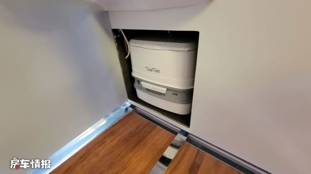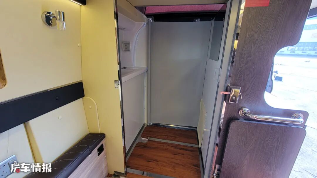 而车内的卫浴室则隐藏在厨房操作台的后方,采用的是整体抽拉式的设计,这个设计也是途酷独有的,将厨房操作台向外抽拉后就可以看到内部的卫浴室了,空间上还是完全可以满足一个人使用的,提供了便携式马桶、洗手台盆和淋雨花洒等,拉上防水帘,就可以进行简单的洗漱了。