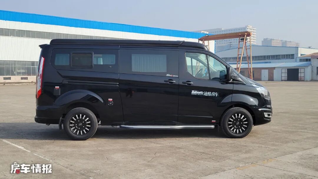这款来自于途酷推出的F378,是一款定位商旅版的B型房车,其全黑色的外观就已经很凸显商务风了,整车是基于福特新全顺V362中轴低顶底盘所打造的,长宽高分别为5341*2042*2134mm,为了和车身相互匹配,四个轮毂也更换为了带有运动风的熏黑轮毂。