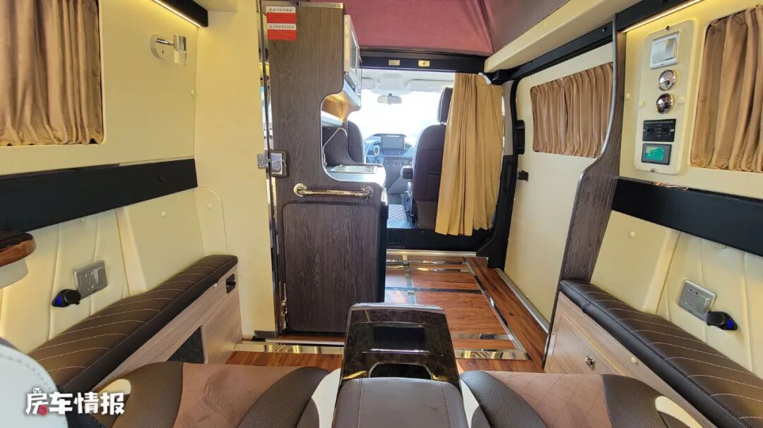 进入车厢内部,整体的装饰风格就和普通房车内部的温馨感完全不同,咖色系的家具和黄色的氛围灯映衬了整体的商务风,而且在布局上也并不是我们常见的房车布局。