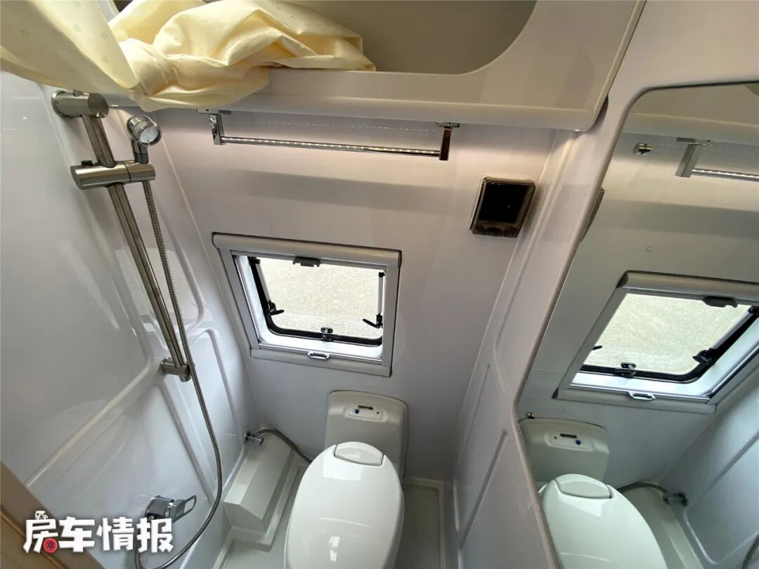 车厢中部提供了独立卫生间,内部空间表现一般,但解决日常个人问题不在话下,提供了换气扇、盒式马桶、梳妆镜、淋浴花洒等设备,另外在底部还有一台燃油锅炉以及过水热系统,为车内提供热水供应。