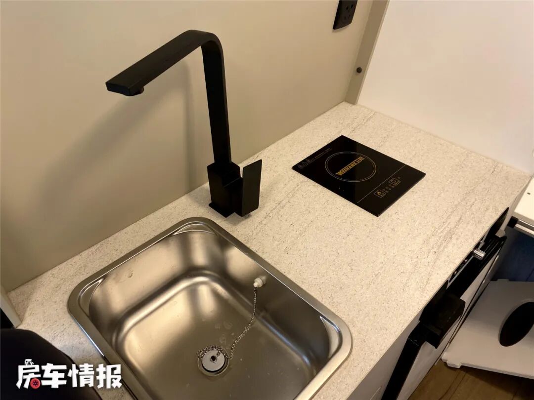 厨房位于车厢右侧,由于独立座椅占据了以往厨房的位置,为此这辆车内的厨房尺寸相对来说要小了一些,但依然提供了高位水龙头、电磁炉、50L冰箱等基础设备,如果想要做饭的话,车外还有燃油灶使用。