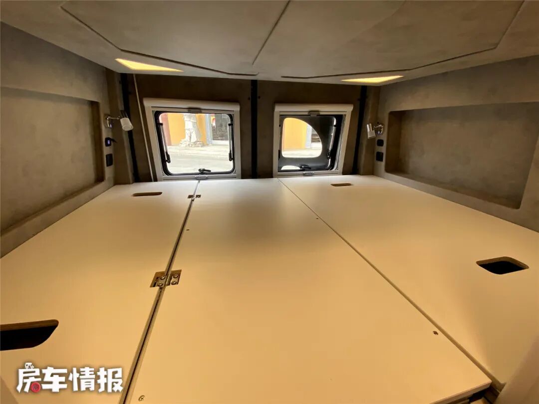车厢尾部就是满足4人休息的关键所在了,常规B型房车都是一张横置床,而这辆车提供的是一组上双层床,下层床铺尺寸约为1850*1300mm,将就着点睡下两名成年人,上层床铺尺寸约为1500*1120mm,在寒暑假可以让小朋友睡在这里,如果只是两个人出行的话,上层床就可以变成一个储物空间,存放衣物被褥都没问题。