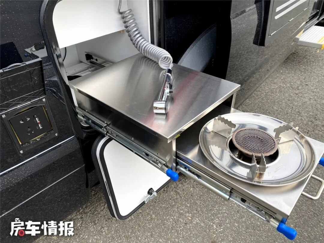 车身后方则提供了一个外置抽拉燃油灶,可以直接从油箱汲取燃料,长途旅行时可以更加方便地获得燃料。