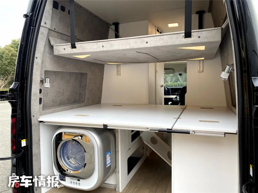 下层床板中部可向上翻折,此时底部形成一个非常大的储物空间,放一些大件行李都没问题,床铺外侧还提供了一台洗衣机。