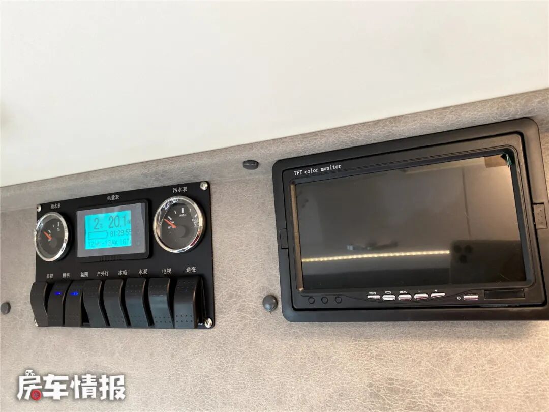 水电方面,这款车提供了3000W逆变器、800Ah锂电池、四路监控和150L净水箱、70L灰水箱,常规状态下两人使用2-3天没有问题,4人的话就要提高一下补给频率了。