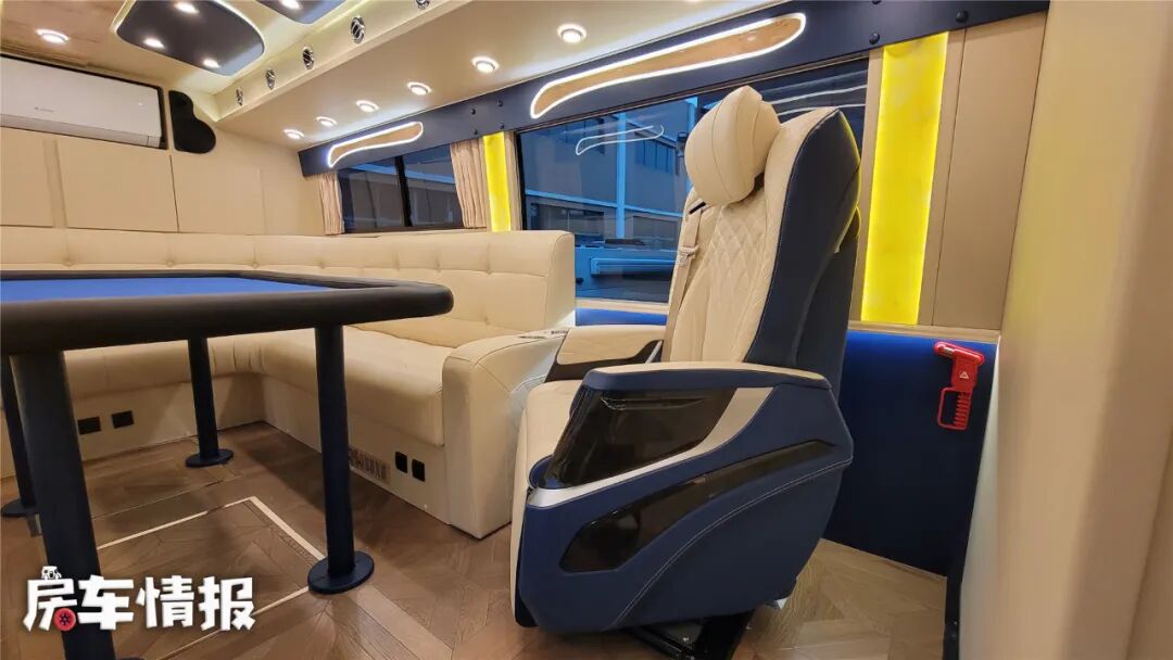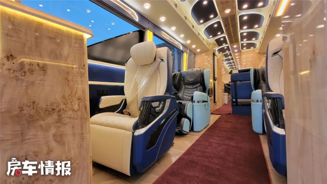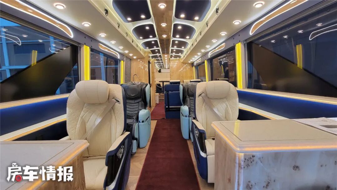 车厢内部的设计和印象中的大巴房车不太一样,这辆车或许称为商旅车更贴切一些,放眼望去,超大的车体让内部空间的纵深也变得很大,像极了一个深不见底的炫彩隧道。