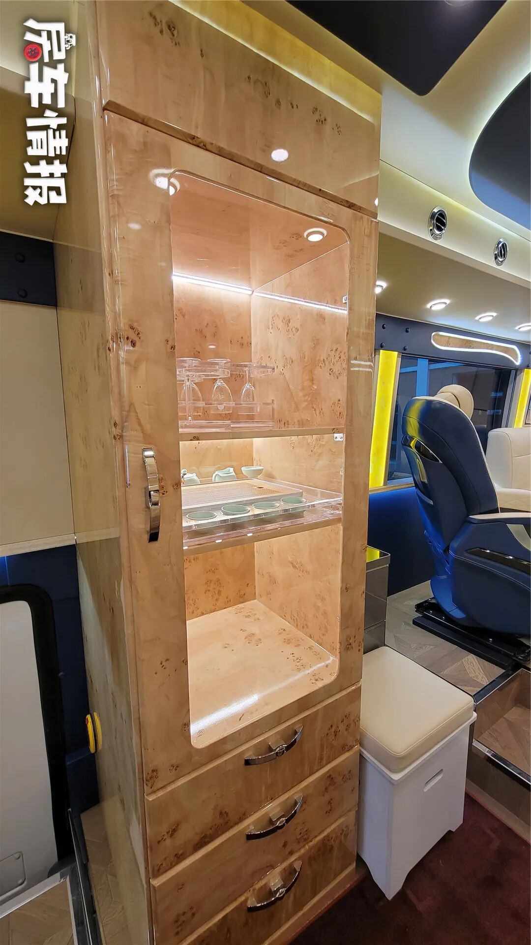 另一侧还设有一个红酒柜,造型比较朴素,内部提供了高脚杯、红酒以及茶具的固定位置,我试试,放在里边的物品固定的都挺牢固,不用点力气和技巧拿不出来。除此以外这款车还提供了5000W逆变器、24V 720Ah锂电池和400L超大净水箱、200L灰水箱。