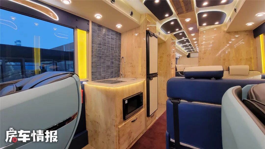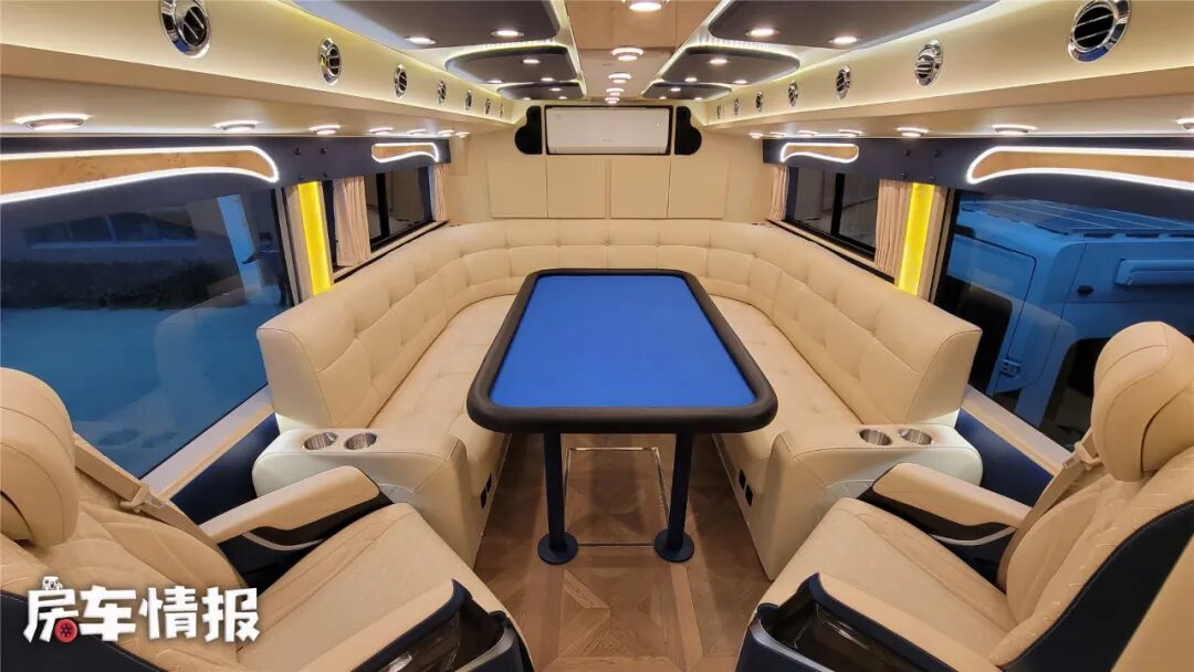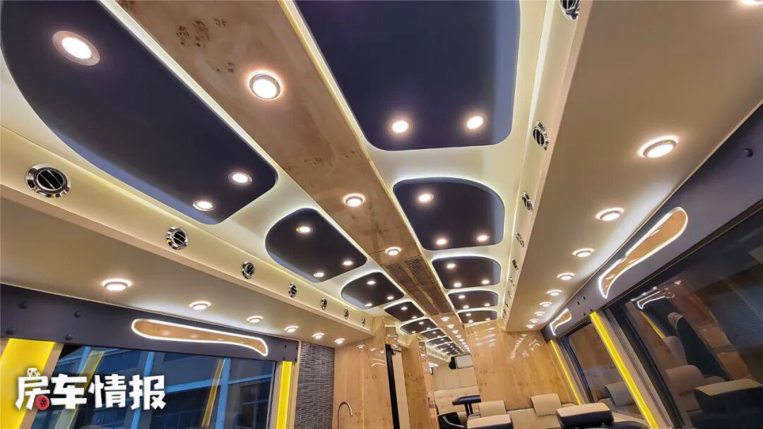 车厢顶部以及两侧全部采用了大量的氛围灯进行装饰,好在氛围灯的造型和颜色比较有设计感,并没有以往同类房车给人的那种“土嗨”印象,反而营造出了不错的豪华氛围。