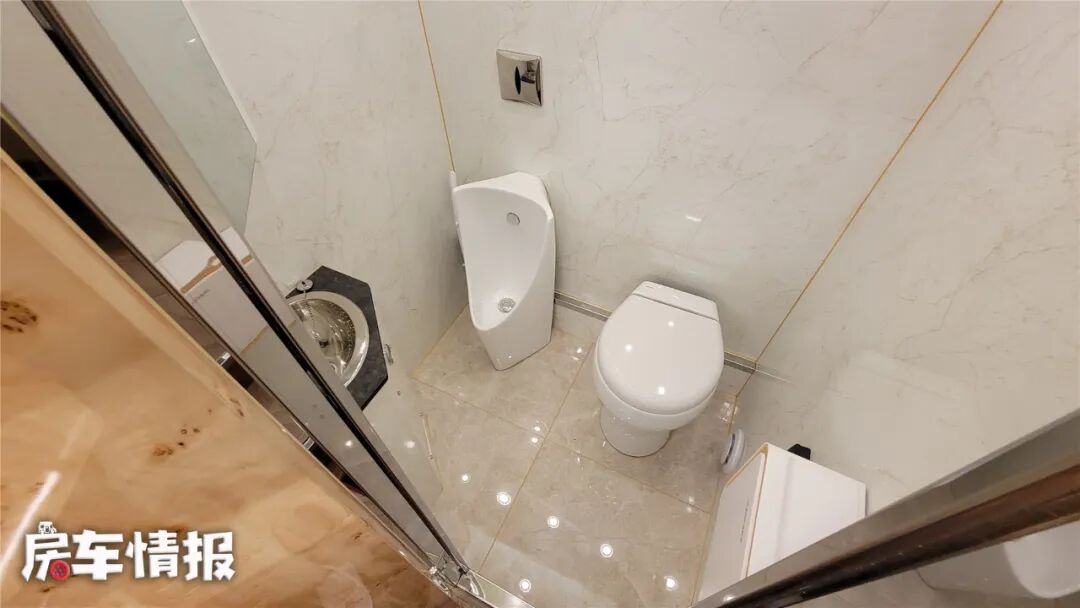 餐厅后方是车内的卫生间所在的区域,卫生间内部的空间挺大,除了常规的马桶、洗手池以外,还有一个大部分的女同志都没见过的装置,一个只会出现在男厕的尿斗,这个设计还挺有意思,如此一来如果是小便的话,可以男女分开。