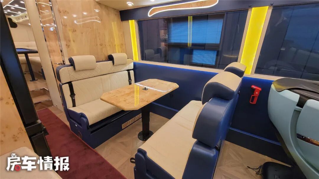 厨房正对着的就是车内的餐厅,四人座椅+餐桌的形式,尺寸对于这辆车来说并不是很大,但临时休息吃个饭没有问题,另外餐厅的四个座椅均带有安全带,行车时可以乘坐。