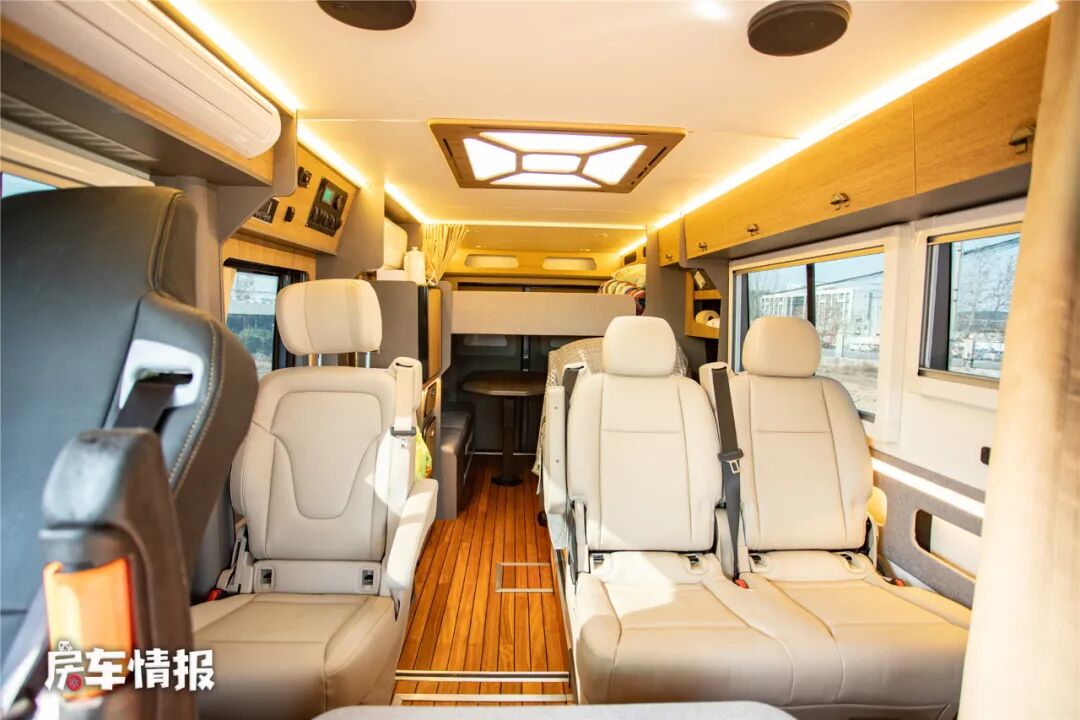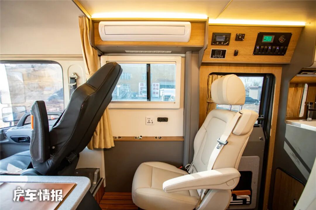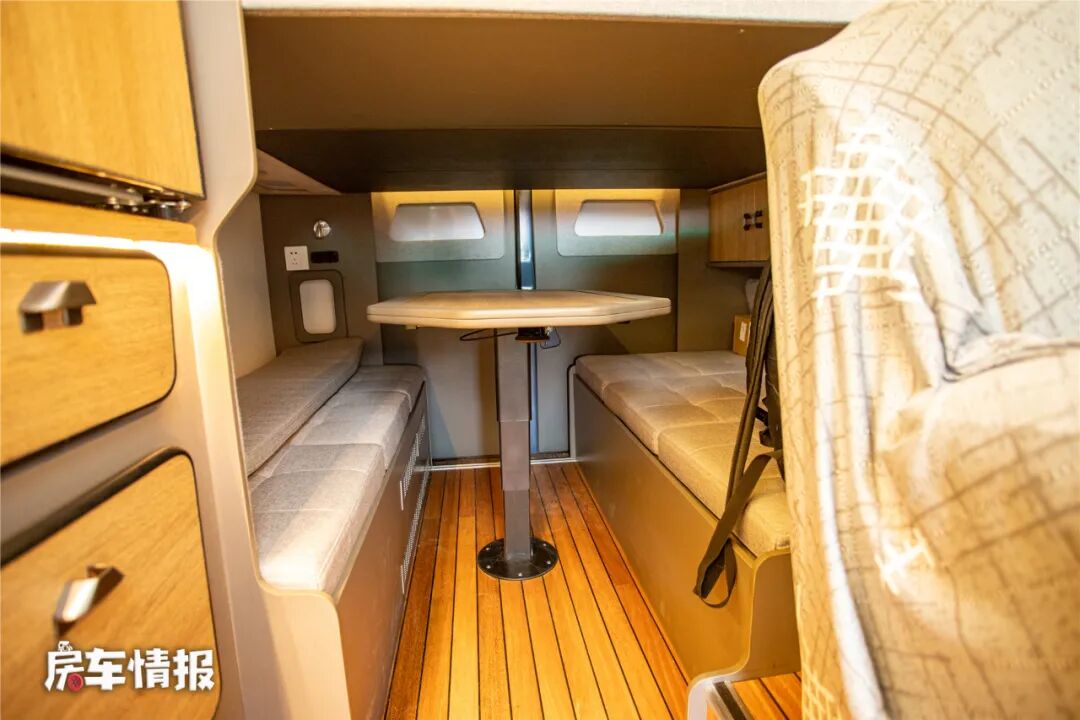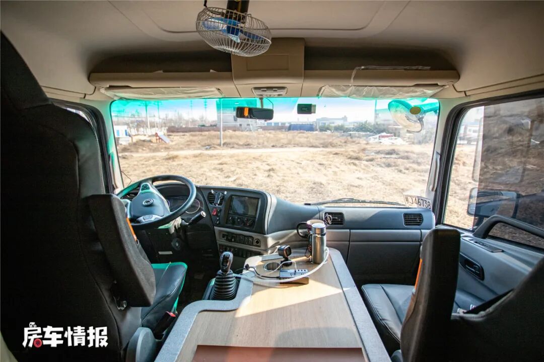 进入车厢内部,驾驶室和后车厢生活区采用贯通式设计,这点和常见的中巴车还是比较像的,如此带来的好处就是驾驶室和生活区融为一体,前后交流都比较方便,不过有一点需要说明的是,发动机就位于主副座椅之间,占据了一定空间,这就导致了这个区域可利用的程度就相对有限,实拍车目前作为一个平台使用,算是比较普遍的一种做法,针对这个区域大家有啥好的设计想法吗?可以在下方评论区与我们互动留言~