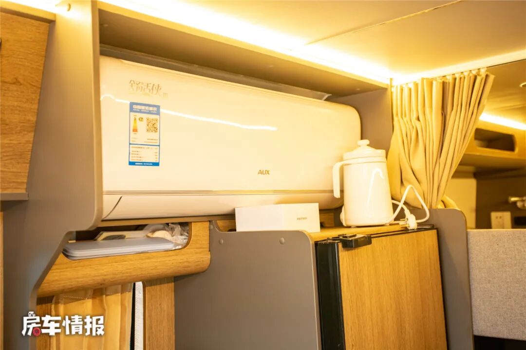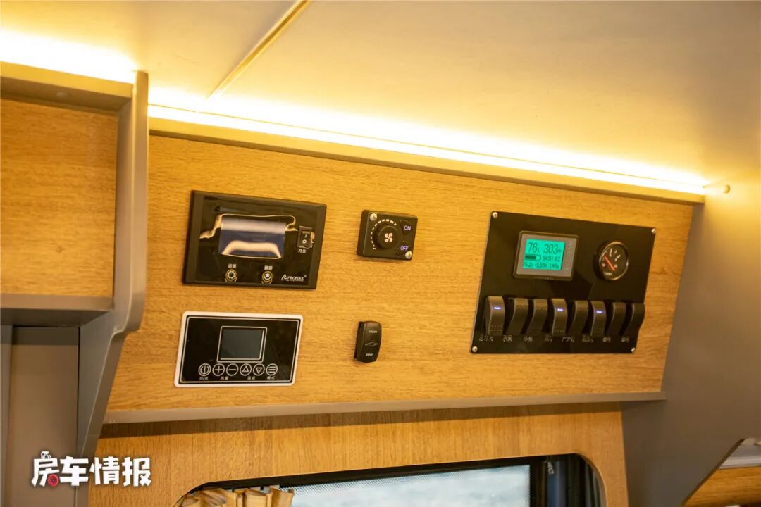 位于车厢顶部还提供了一台12V行车空调,除此以外车厢后方还提供了一台家用变频空调以及柴油暖风机,可以根据不同温度和使用环境来选择适合的取暖制冷方式。
