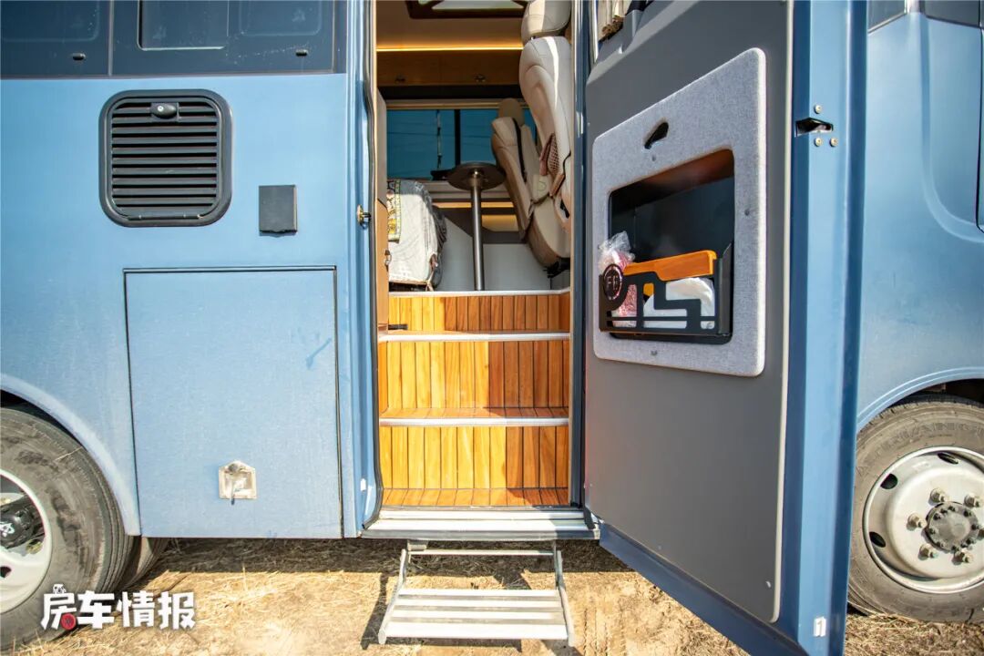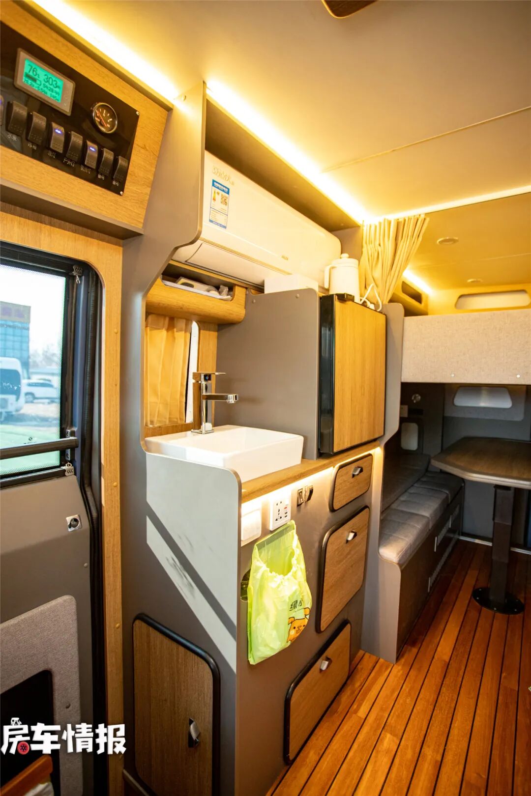 由于是车主定制的车型,车内并没有选择卫生间,日常洗漱的话可以通过中门后方的洗手盆,同时这里还提供了一台小冰箱,容积不大。需要注意的是,工信部新规里有明确规定“申报旅居车内部必须有独立卫生间设施”,为此这款车的布局样式也将成为绝版。