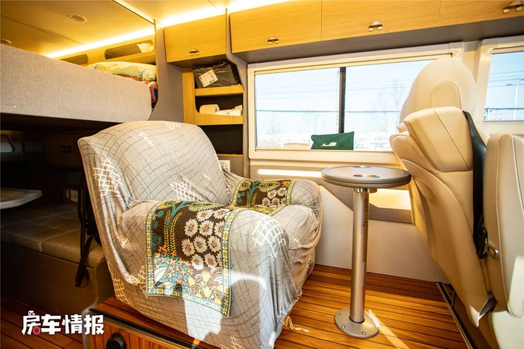 比较有趣的是,这辆车的车主在后方选装了一个超级舒适的芝华士沙发,日常休息的时候坐在这里相当惬意,搭配前方的小餐桌使用,吃饭、看电影、轻办公都没问题,这就是定制的好处吧,可以随心情来定~