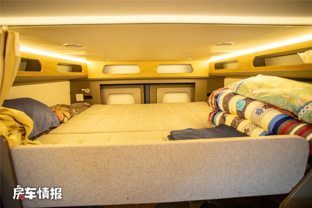 车厢后方车主选择的是一组上下双人床的布局方式,上层窗尺寸为2100*1500mm,可以睡下两名成年人,床板还可向上掀起。