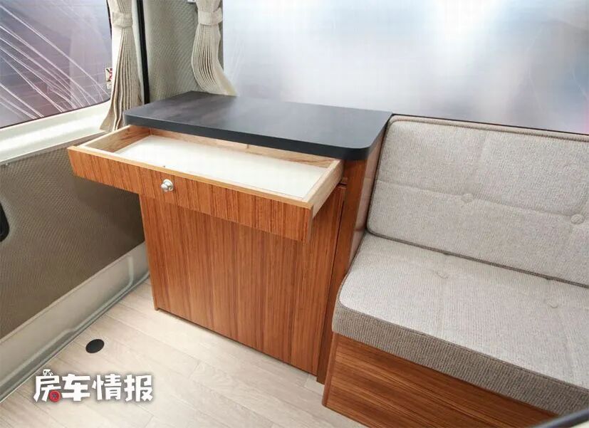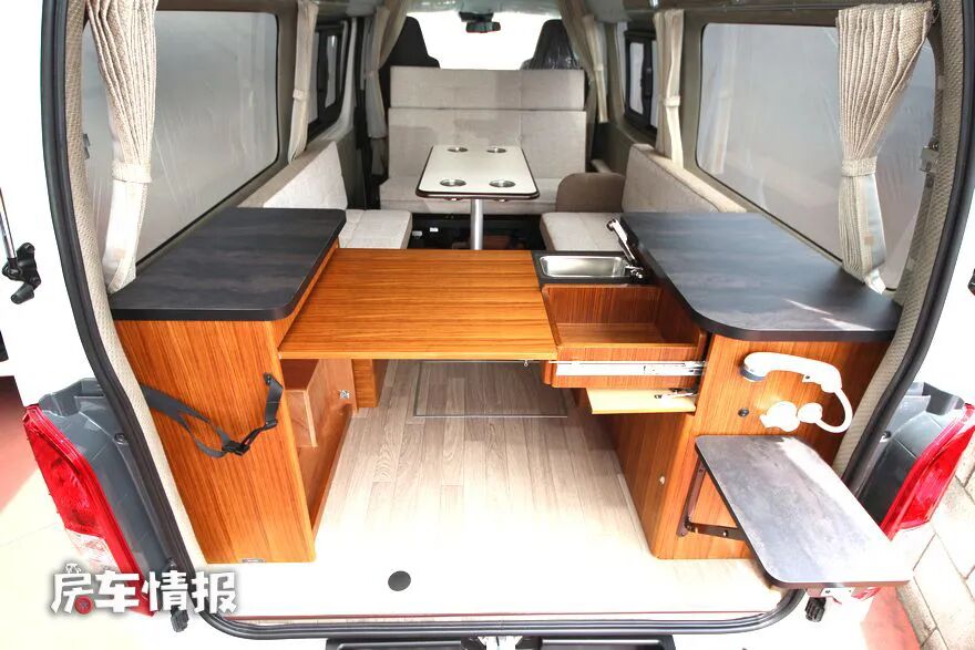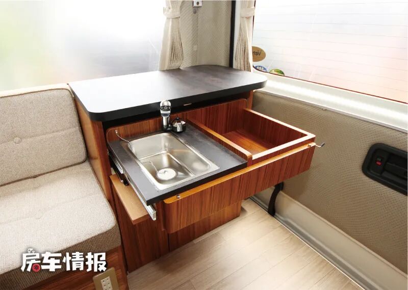 除了设计的比较新颖的睡卧区,车厢尾部的功能区也比常见床车内部的生活区要更为宽敞,两侧的储物柜尺寸表现都不错,一侧中间带有抽拉的桌板,和储物柜。另一侧的柜子抽屉里则隐藏着小型的不锈钢洗菜池,同时,全车还配备了一个卡式炉,基本上简单的煮面烧水还是可以满足的。