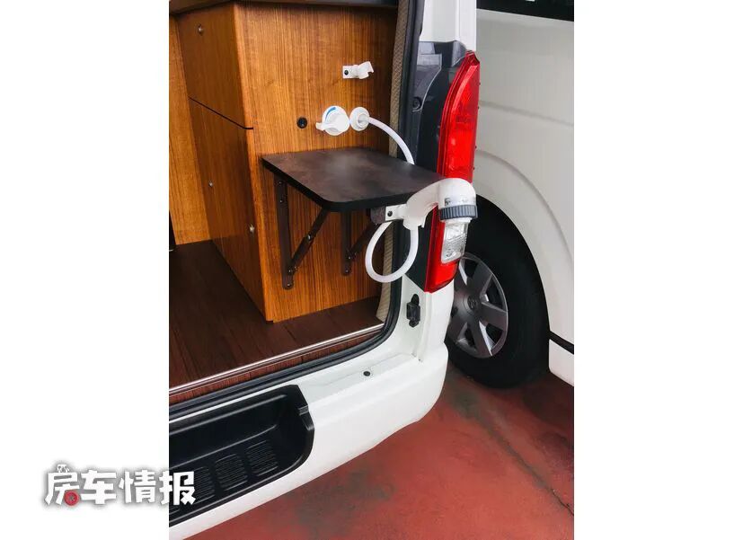 打开后尾门还可以看到右侧储物柜侧面还有折叠的拓展桌面以及外置的淋浴花洒,日常也可以在车外进行清洗。