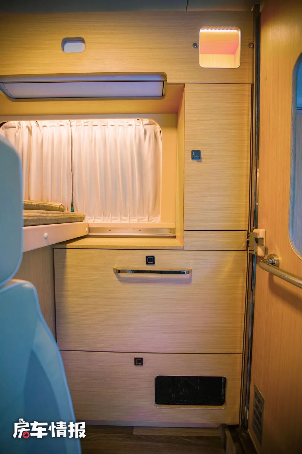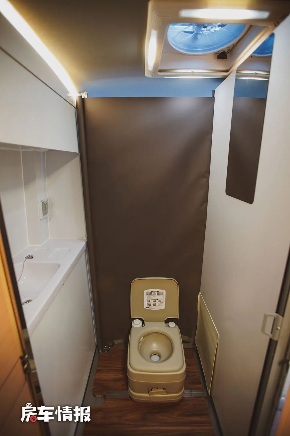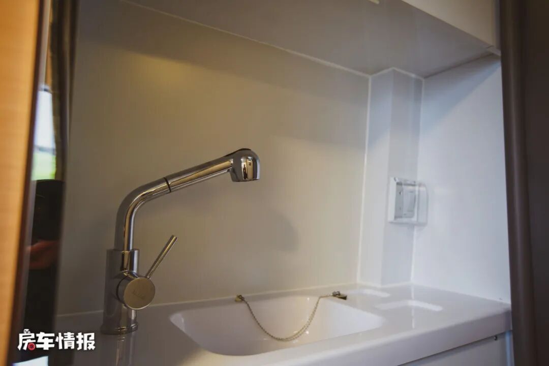 但是注意到下方的轨道了吗?说明这是暗藏机关的,只需要将操作台整体向外抽拉,后面就呈现了一间独立的淋浴间,而且里面还配置了独立的洗手台和抽拉花洒,顶部也加入了换气扇的设计,下方则是防水的地板,另外整体空间上也能够容纳一个成年人使用的,外面厨房操作台下方的储物柜里还随车配备了一台便携式马桶,这样在满足日常洗漱洗澡的需求之外,还能解决临时的内急问题。