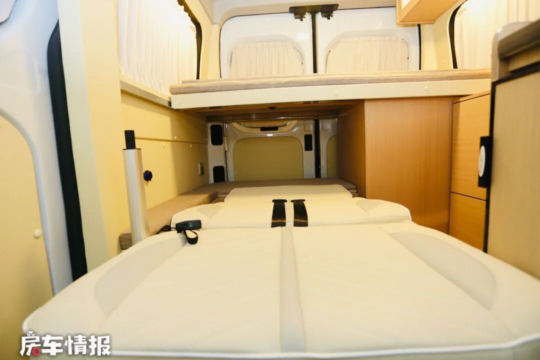 说到休息区,这个时候您可能会问,车厢尾处只有一张单人床,怎么睡下两个人呢?其实这张固定的单人床可以拓展的,打开之后宽度达到了1450mm,完全可以容纳两个成年人,而下方的双人乘客座椅放倒之后与后方也能拼接形成的一张尺寸为1950*1020mm的临时沙发床,只不过整体的平整度欠佳,适合临时的午休。