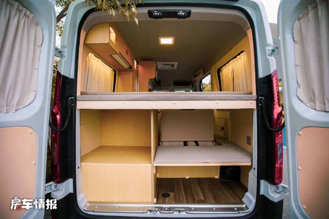 我们都知道储物空间一直是B型房车的软肋,因为空间有限不仅要容纳基础的生活配置,还有预留出能存放日常物品的储物空间,这辆车的内部和尾部都提供了可放置物品的储物空间,足够存放一些大件的行李。
