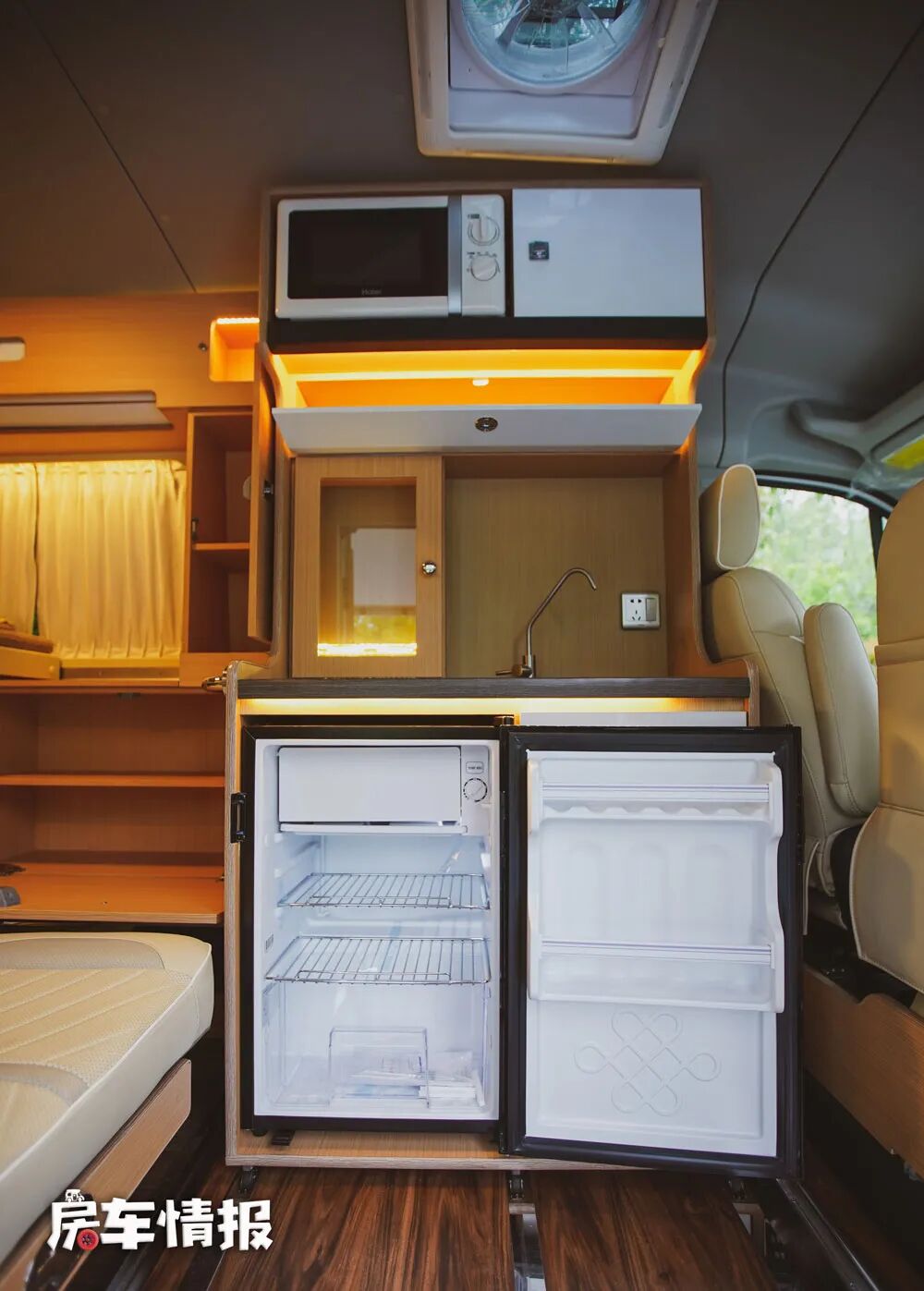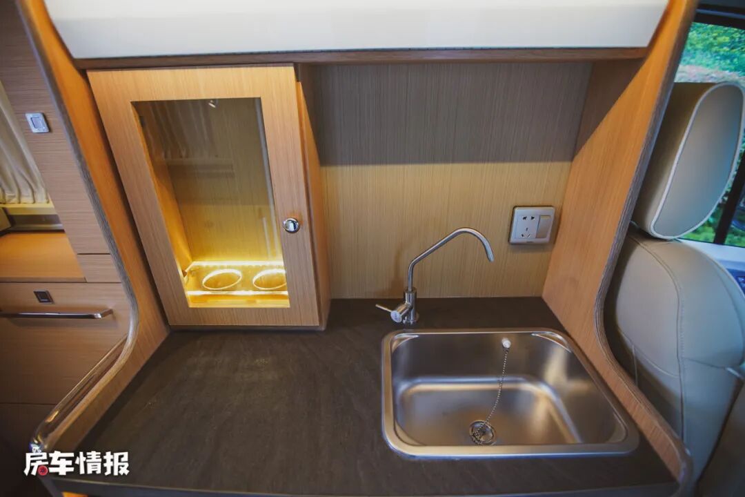 这个专利设计就是位于车内的厨卫区,从表面上看似是一个比较普通的厨房操作台,虽然整体的空间不能媲美C型房车,但是配置还是挺全的,包括基础的水槽、便携式的电磁炉、微波炉和一台88L的车载冰箱。最有意思的是台面上还设计了一个带有氛围灯的小型酒柜,也平添了几分精致感。