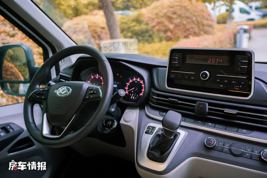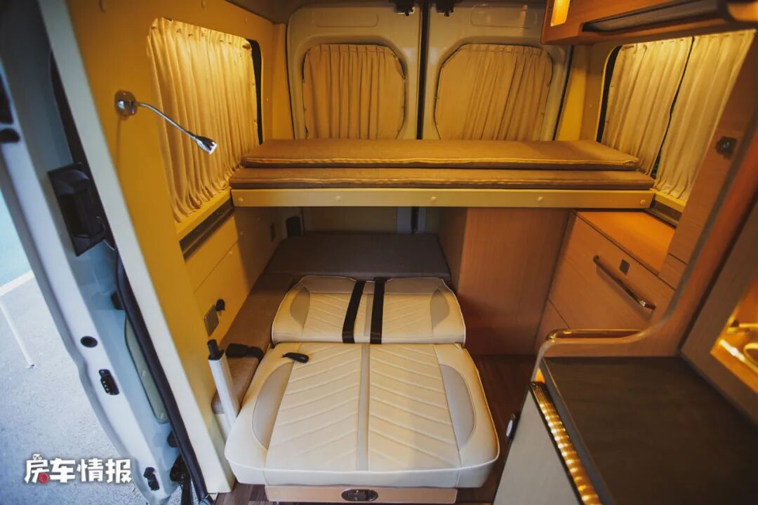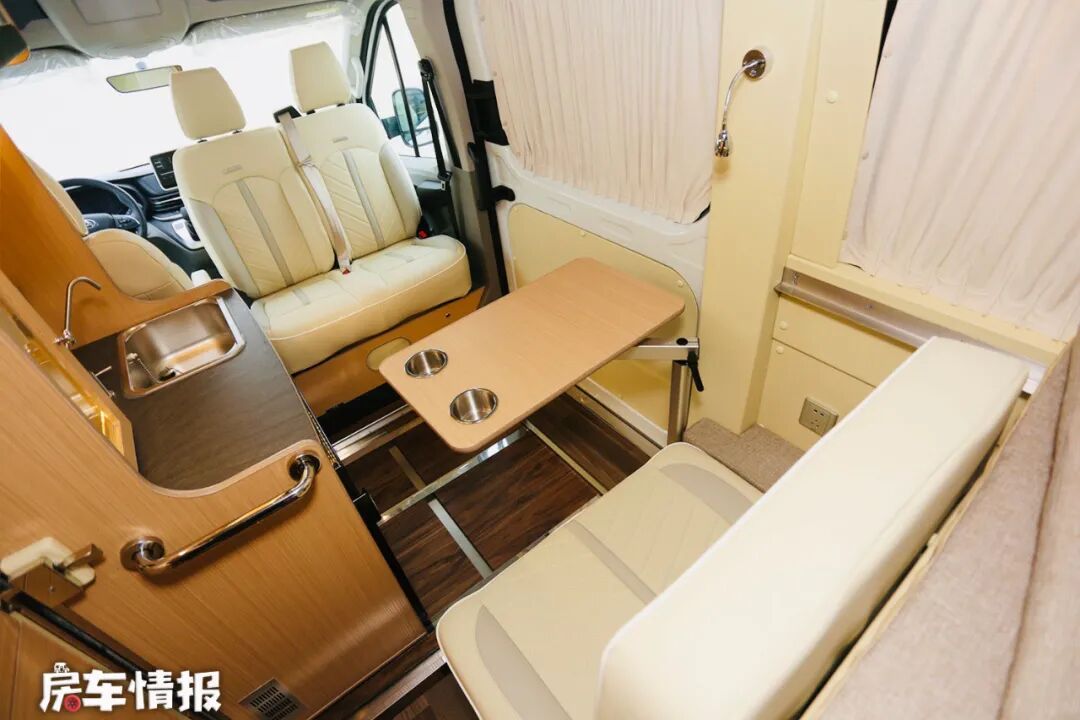 这款房车名为D518,顾名思义,整车的长度只有5.18米,宽度为2062mm,高度则为2610mm,在这有限的空间内,整车取消了我们常见的固定式会客区域,而是将前方1主2副的两个副驾驶加入了可向后旋转的功能,这样当支起小餐桌,配合车厢内的双人沙发座椅,就可以形成一个临时的四人会客区域,驻车的时候操作起来不仅很方便,行车的时候又不占用后方乘客的腿部空间,可以说很合理的设计了~