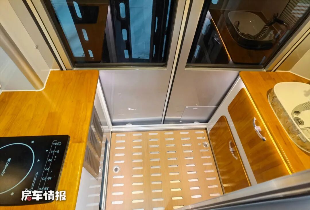 最后是车尾部集厨房洗浴功能为一体的区域,左边是带有一台电磁炉的橱柜,右边是带有不锈钢水槽和抽拉水龙头的储物柜,下面带有下水口,使用起来也比较方便。