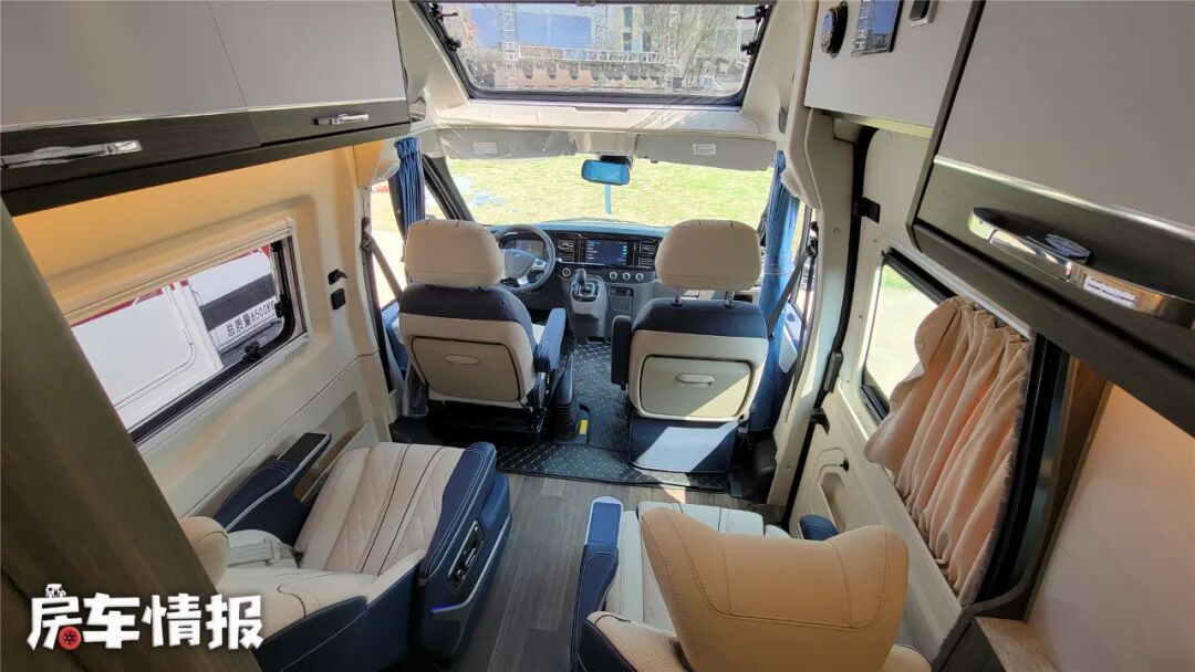 生活区采用无软包处理,无异味儿、更环保,全新材料开模的吸塑件手感更舒服,另外车内的空间感也挺不错,没有了以同类车型的局促感。