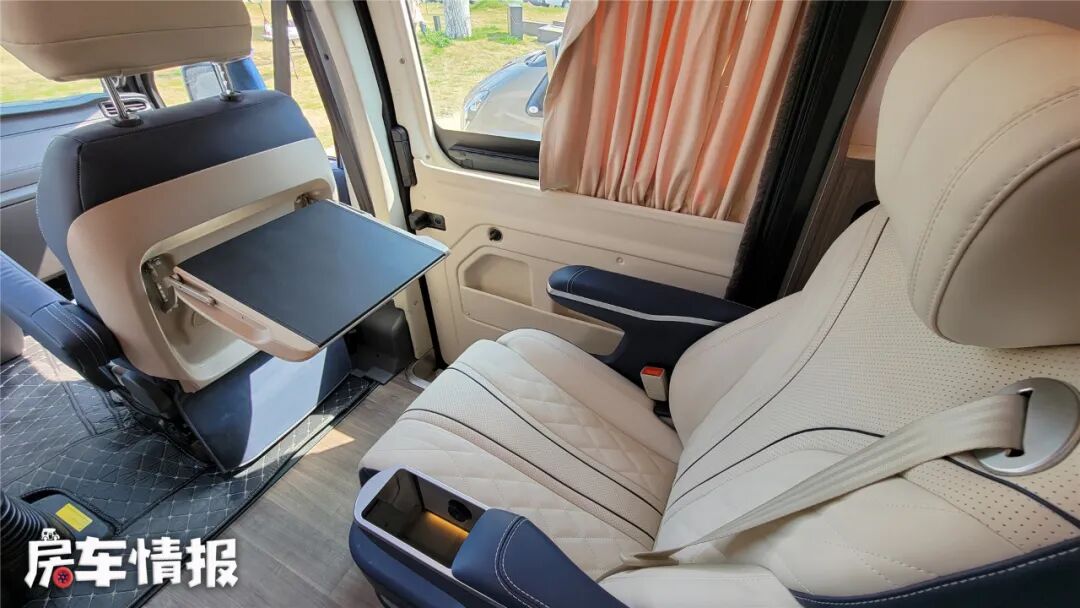 位于主副驾驶座椅的靠背后方,分别带有一个可折叠小桌板,打开以后可以简单办公或吃饭,这点更有商务车的感觉了。