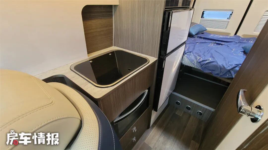 为了给商务座椅预留更多调整空间,后方的厨房区域被缩小,车内厨房提供了洗菜池、微波炉、房车专用冰箱等,如果想要做饭的话可以使用车外燃油灶。