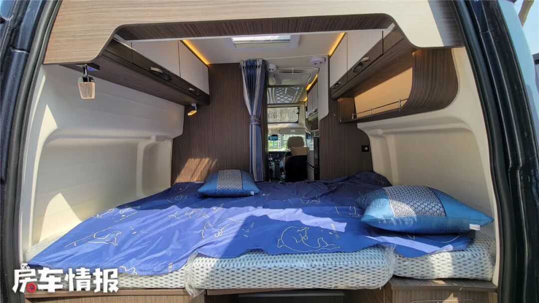 打开尾门,便是车内的横置双人床,尺寸达到了2米*1.35米,可以算是同类型之最,B型房车睡下1米9大个也不再是难事儿~