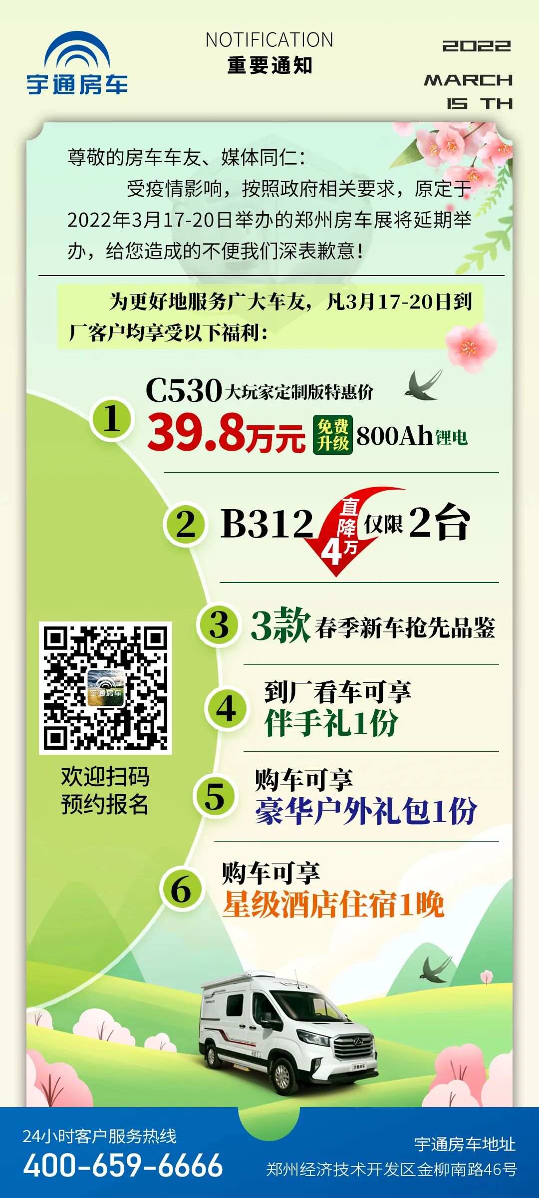 因疫情影响,原定于2022年3月17-20日举办的郑州房车展将延期举行,但为更好地服务广大车友,宇通房车推出到厂看车福利活动,凡3月17-20日到厂的客户均可以享受伴手礼1份,另外还有六重购车福利等您拿!具体活动通知如下: