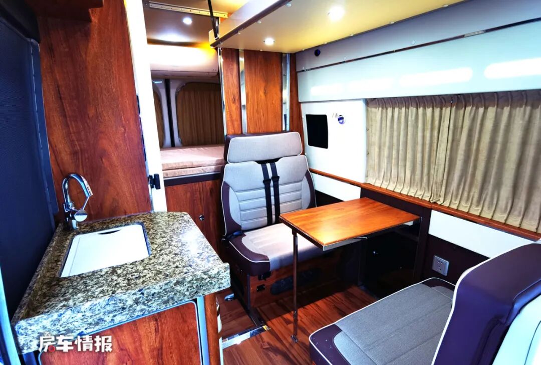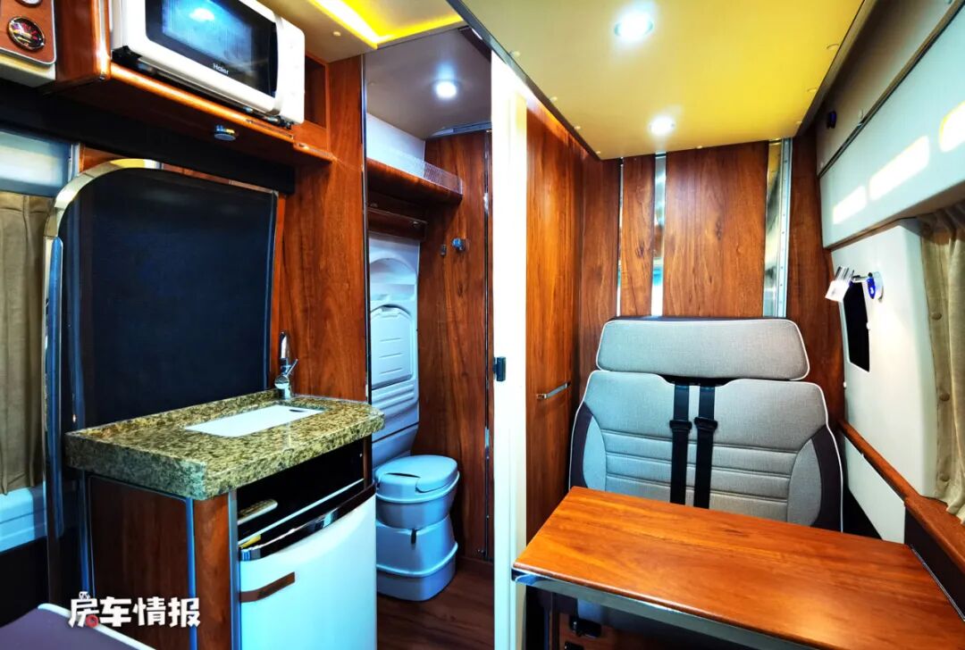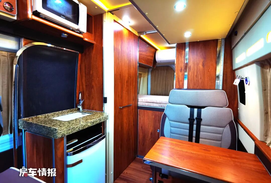 会客区旁边一侧是全车的厨房操作台,台面上提供了基础的不锈钢水槽,上方嵌入了微波炉,下方则是一台85L的车载冰箱,搭配车外的抽拉灶台,也能满足基础的烹饪需求。