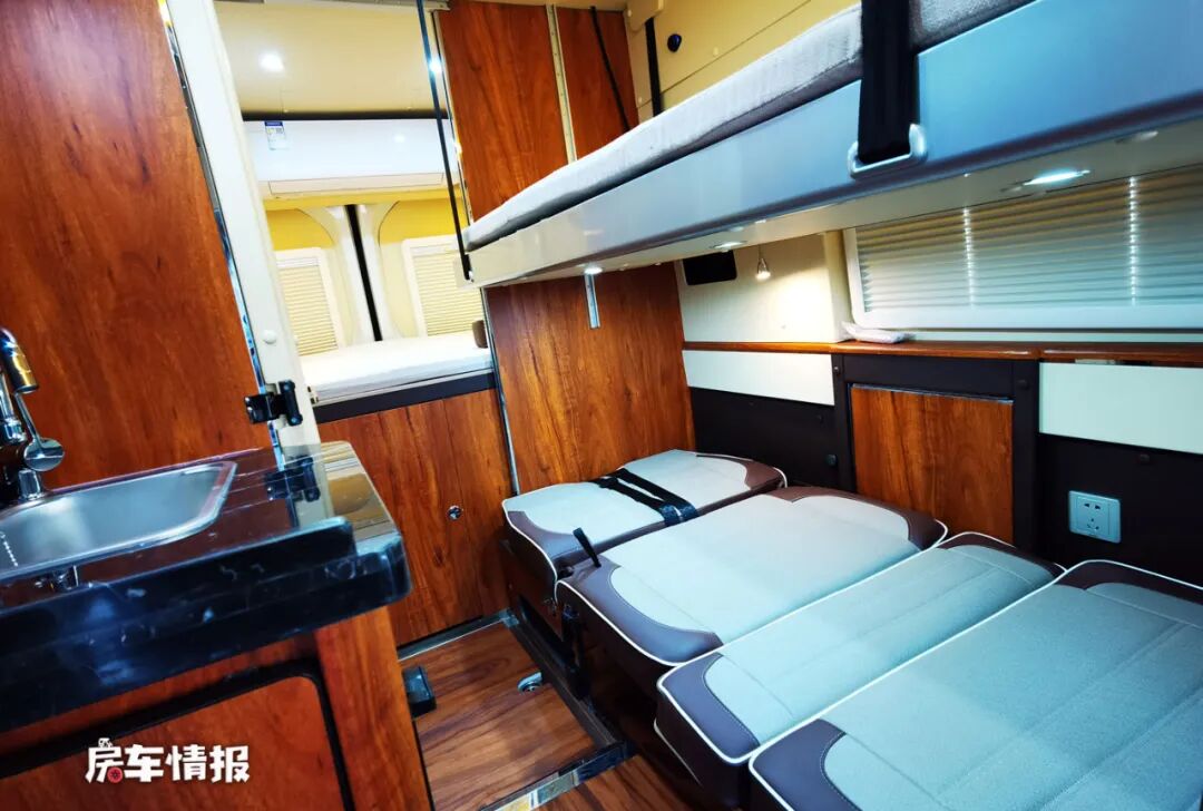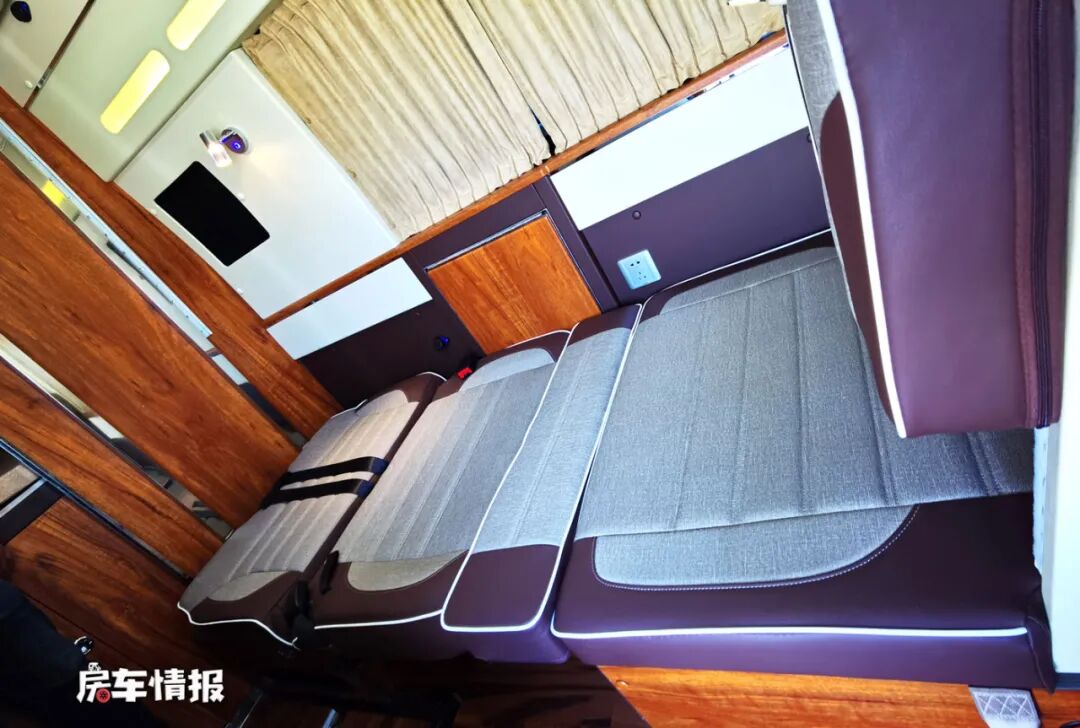 第三个独立区域则是全车尾部的休息区,采用了横置双人床的设计,尺寸为1900*1500mm,身高在1.9米以下的成年人也能睡下两名,床铺前方还带有一扇可推拉的隐私门,拉上之后就能打造出一个完全独立的休息区了,这也是整辆车的第三个独立空间。