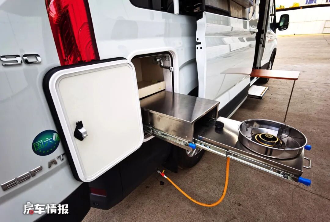 车内带有基础的手动遮阳棚与户外抽拉灶台,也可以满足在车外进行烹饪的需求。