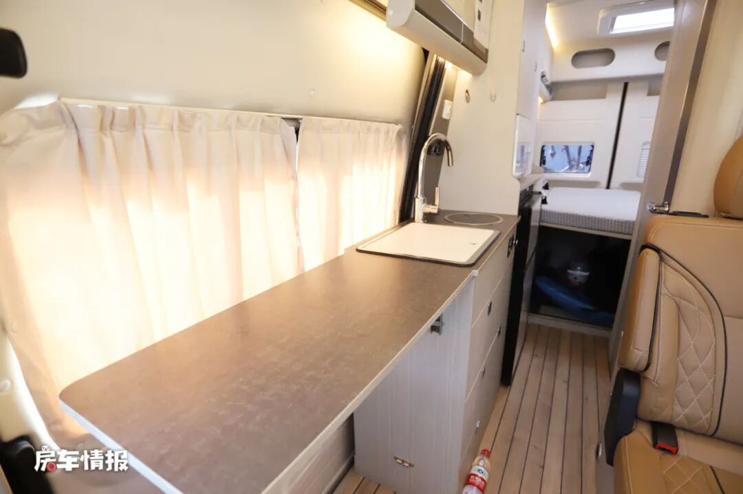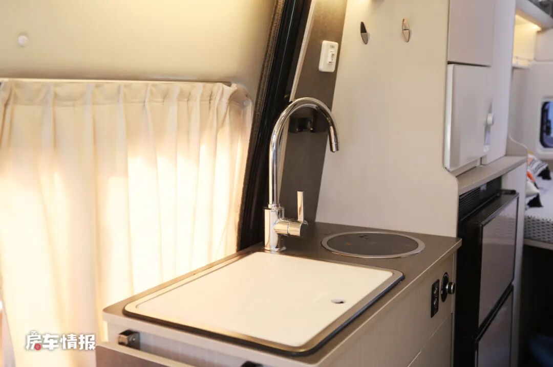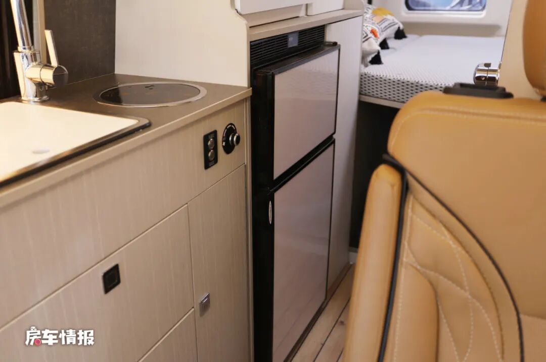 车厢中部依然是整车的厨卫分区,靠近乘客门处的是厨房操作台,侧面带有可拓展的备菜桌板,台面上则配置了基础的水槽和电磁炉,后方则是一台118L的双开门冰箱,日常的基础烹饪均可以满足。