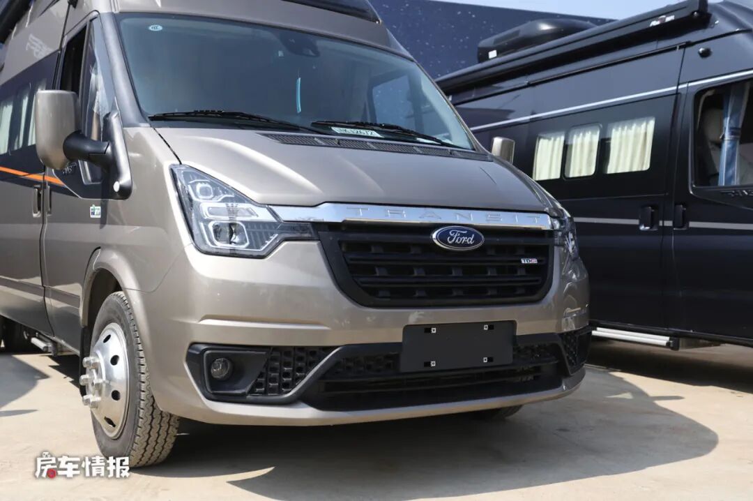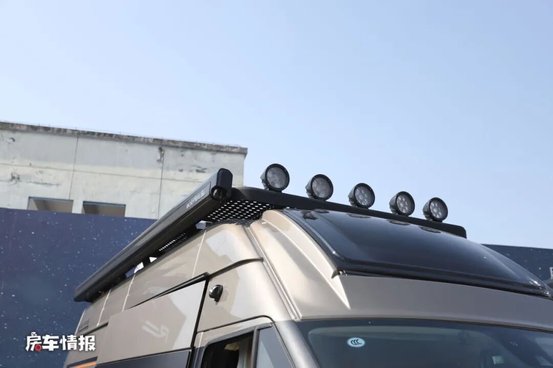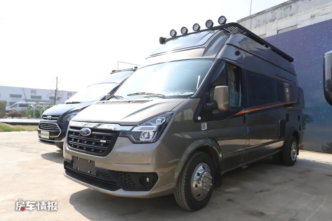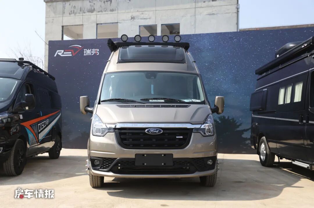 首先是在底盘上,搭载了福特新全顺Pro底盘使整辆车在外观上更具有霸气的感觉,尤其畅旅版车型在顶部加入了户外探照灯以及尾部的登车爬梯和自行车架,使整辆车看起来更有运动越野的感觉。