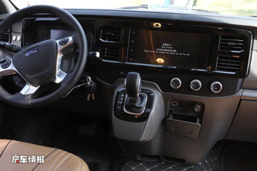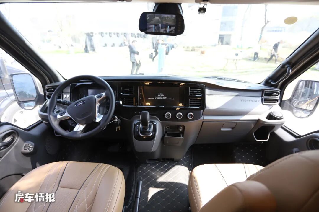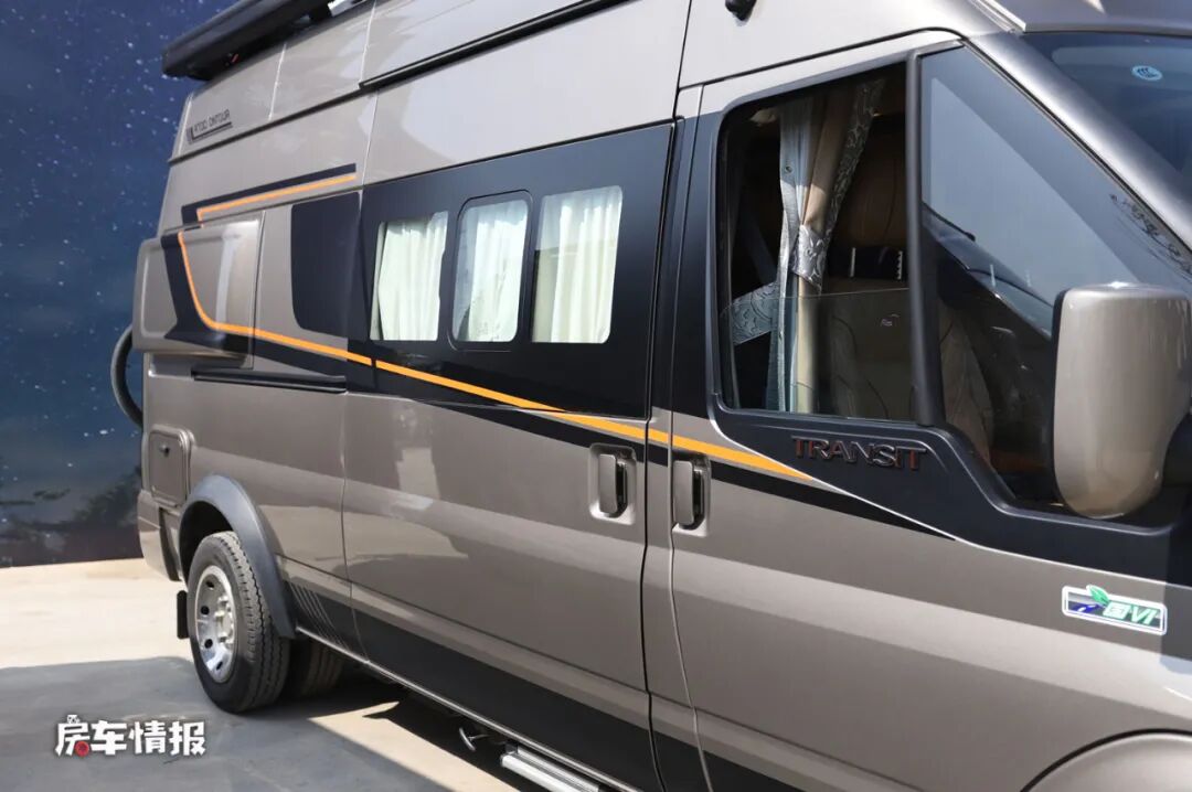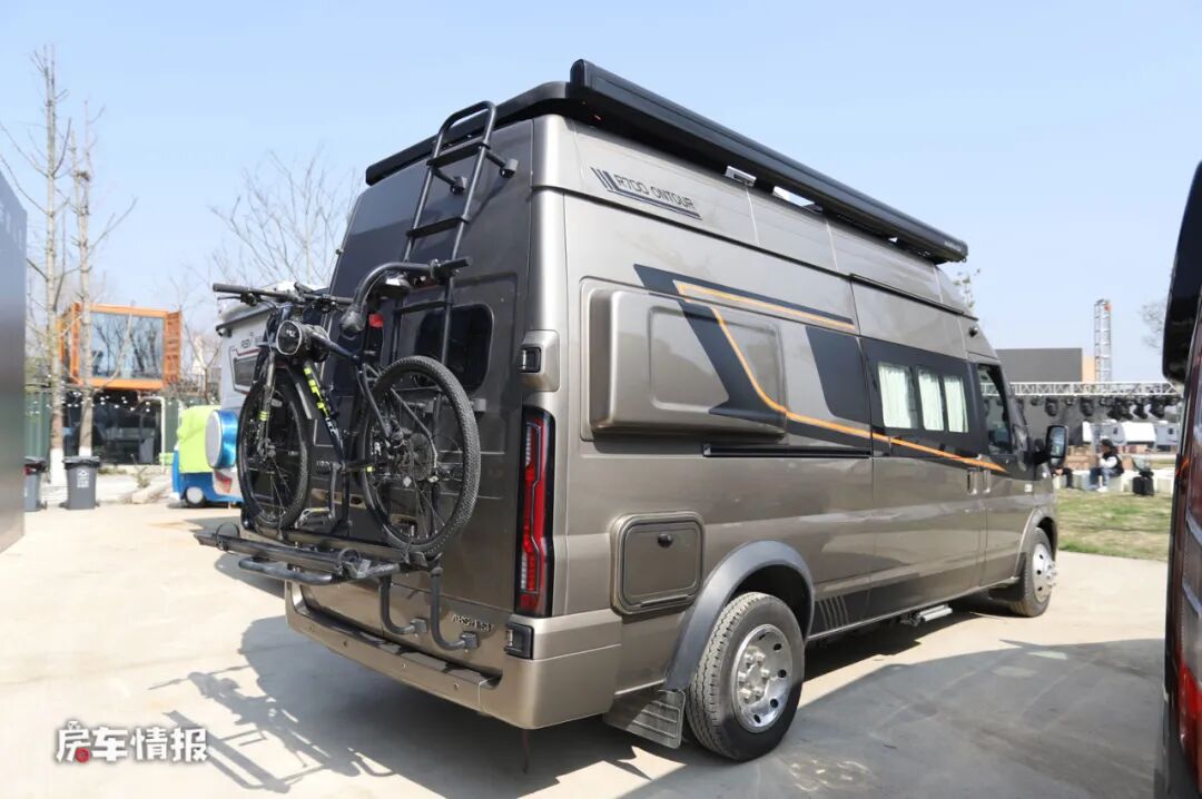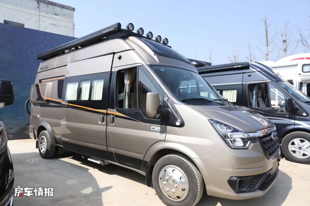 首先是在底盘上,搭载了福特新全顺Pro底盘使整辆车在外观上更具有霸气的感觉,尤其畅旅版车型在顶部加入了户外探照灯以及尾部的登车爬梯和自行车架,使整辆车看起来更有运动越野的感觉。