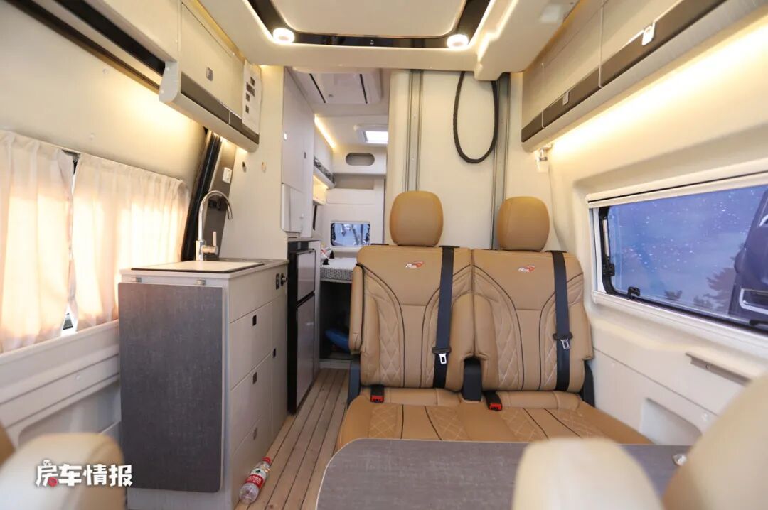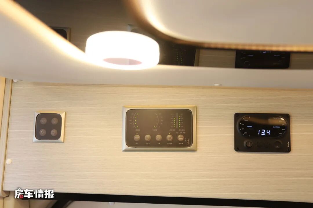 水电路上,这款房车是搭载了3000W的逆变器、12V 800Ah锂电池,并且带有低温电加热功能,以及提供156L的PE净水箱、66L的PE灰水箱,另外全车还配备了5000W的埃贝赫燃油暖风机,以及顶部是一台Telair的顶置空调,扁平式的设计扁平式设计不仅提升了整车的通过性,而且也保障了车内的生活空间,这些设备基本上可以满足随车长时间长距离自驾游。