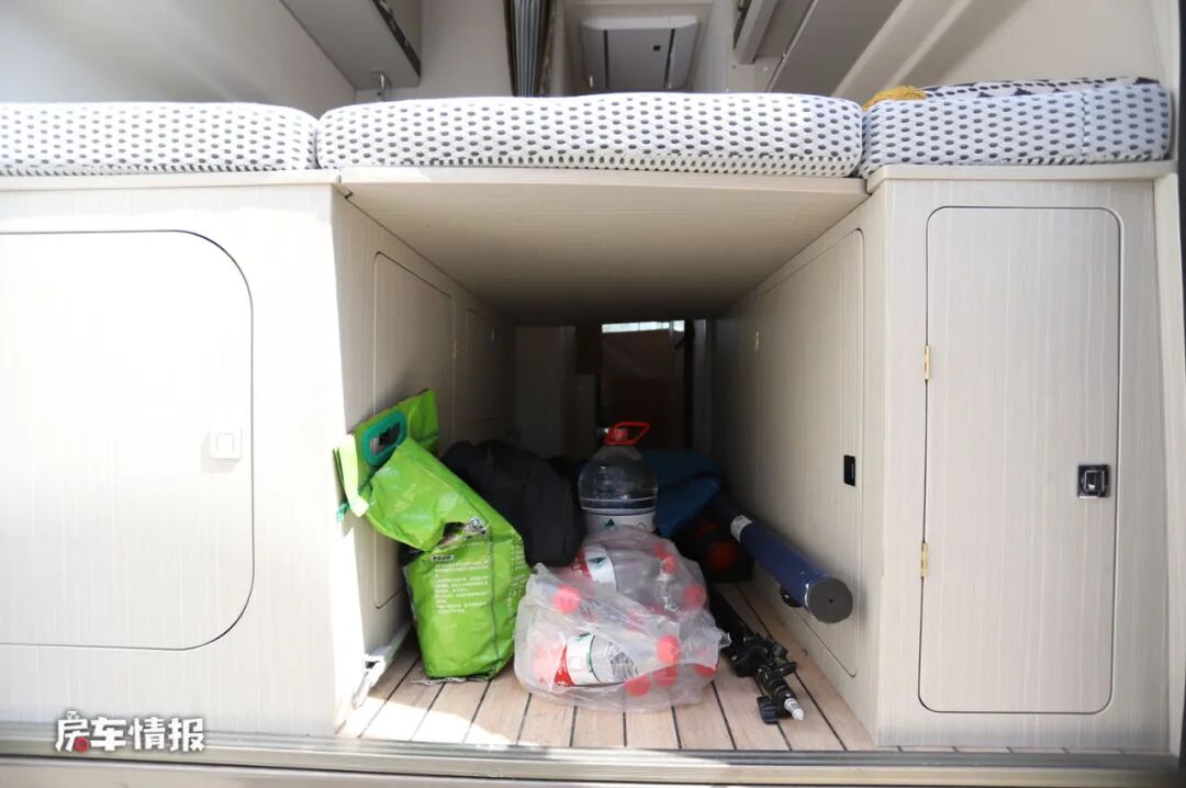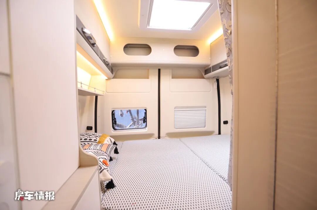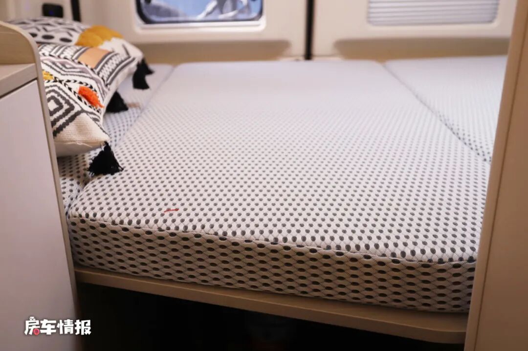 作为一款核载四人的车型,这款车也提供了两个休息区,一个是车厢最尾处的横置双人床,尺寸为2000*1350mm,因为瑞弗特有的后凸式车窗设计,所以这张床在同类车型中也算是比较大的了,床垫还是采用了4D空气防螨床垫,无论是对于年轻人还是老人儿童都比较适合,另外两侧顶部和床板下方都提供了储物的地方,可以用来存放日常的物品。
