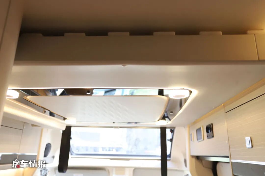 而另外一张床就隐藏在车厢前方的顶部(选装配置),也就是第四个亮点,和前两款启界车型不同的是,这是一款最多能够容纳四个人休息的车型,这张床铺的尺寸也达到了1900*1200mm,睡两个成年人也是没有问题的。