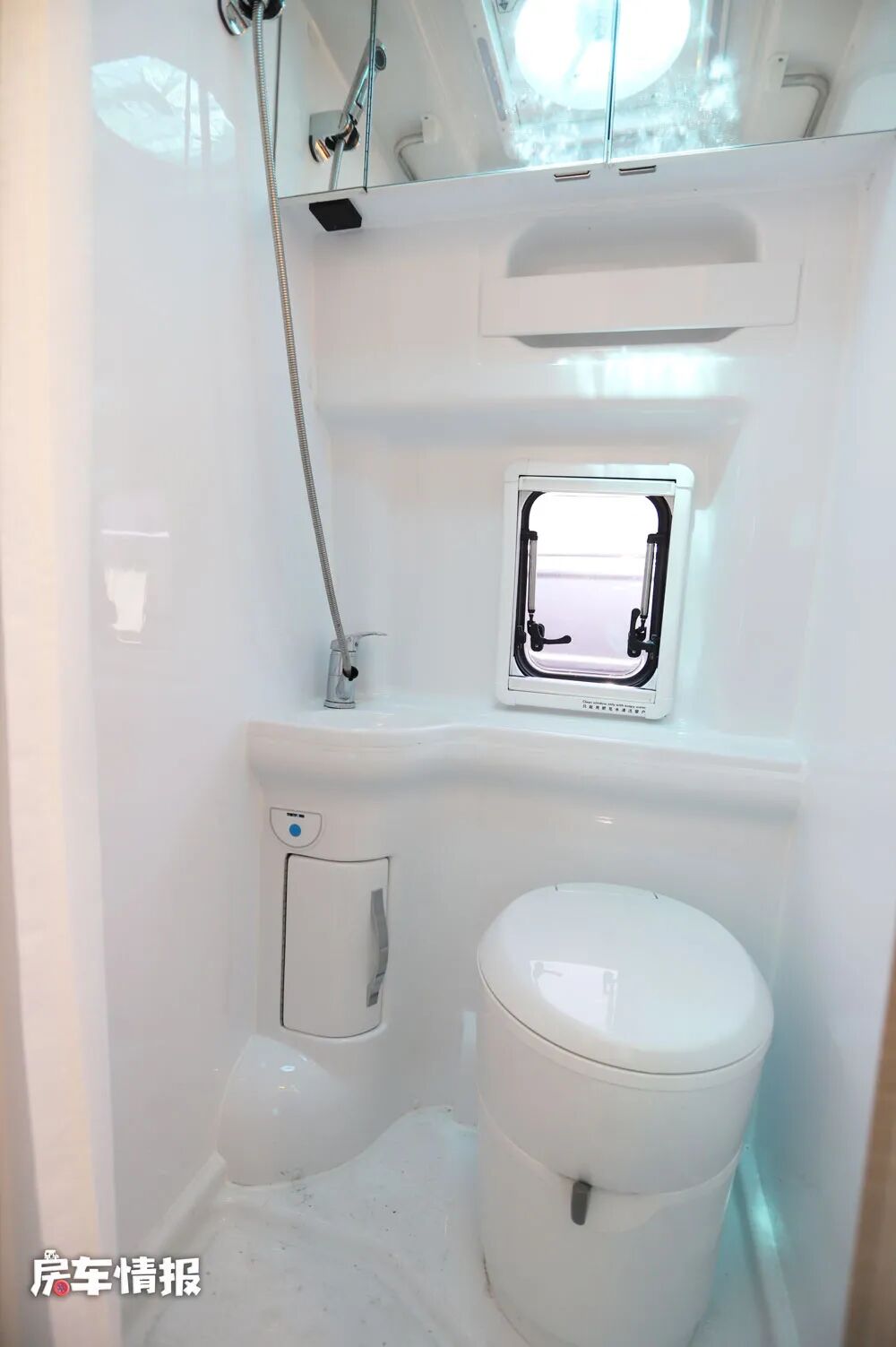 内侧则是全车的独立卫浴室,采用一体吸塑式的设计能够防水防潮,并且可以延长整体的使用寿命,在基础的洗漱设施之外还配置了一个可翻折的晾衣杆,搭配顶部的换气扇,可以说非常实用的一个设计。