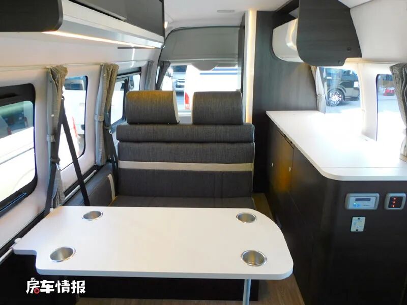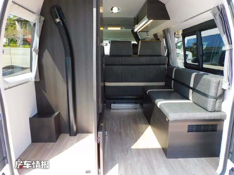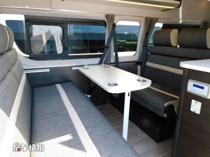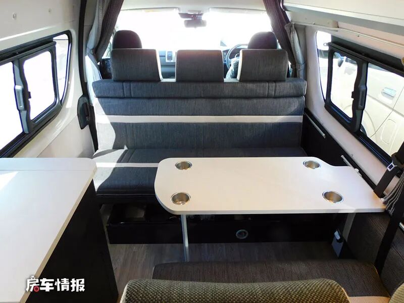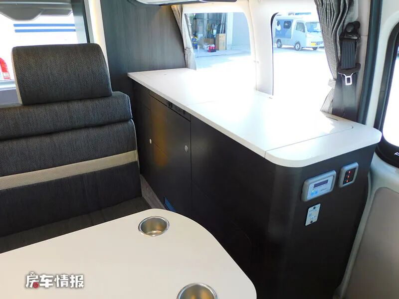 和传统的日本床车相同的是,前排乘客座椅都带有可翻折的功能,所以驻车时可以将座椅向后翻折,与后方形成一个面对面的布局模式,侧面墙壁也提供了餐桌的卡槽,这样支起小餐桌就能够满足基础的就餐需求。