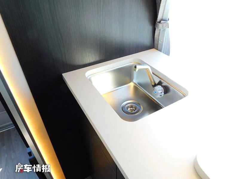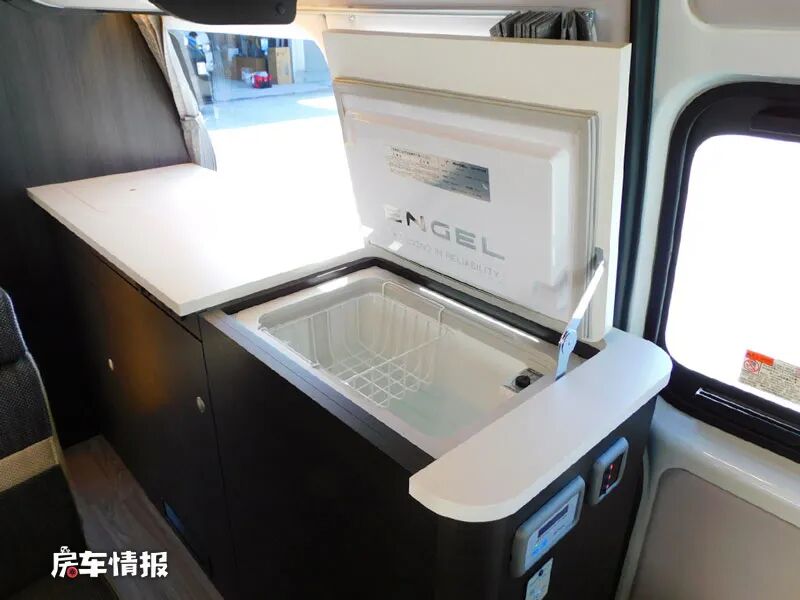 而第三排座椅只能坐两个人的主要原因还是因为侧面多了一个厨房的功能区,这个操作台的尺寸比我们国内的大多数房车内部的操作台尺寸都要大,而且也提供了基础的翻盖水槽以及40L的翻盖车载冰箱,这样配上便携式的卡式炉或者电磁炉,就可以解决基本的烹饪问题了,后期有需要,还可以加装微波炉等小型的家用厨具。