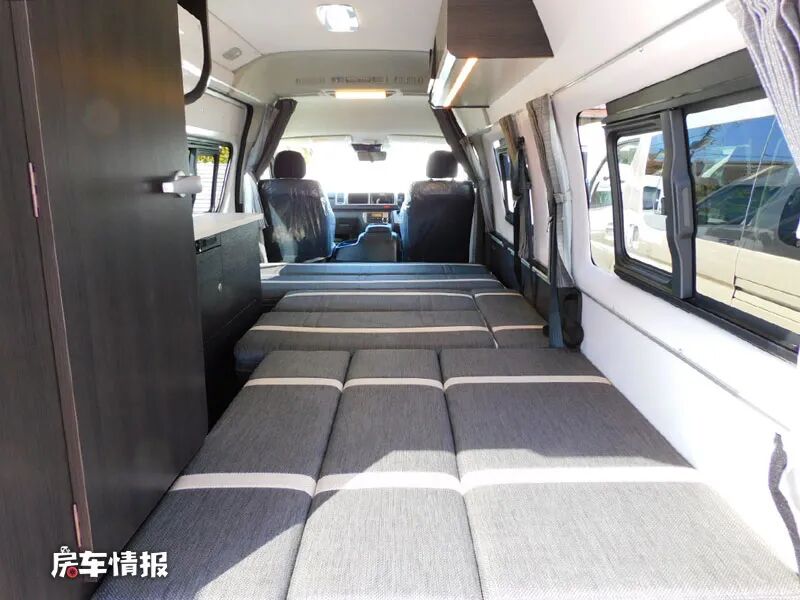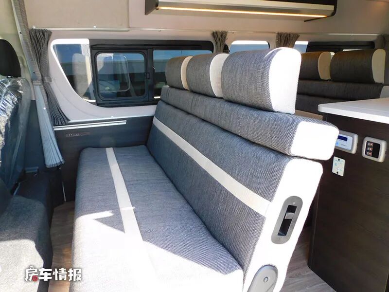 而另外一侧,也就是车厢的尾部同样设置了一排长条座椅,这张座椅更多的用途是当夜晚来临的时候,作为床铺的延长区使用的,把前面两排的座椅放倒放平,与最后这张长条座椅一起拼接组合,也能够组成一张可以容纳两个人使用的沙发床,其最宽处可达1.5米。而为了确保夜晚的隐私性,车窗上都配有拉帘,顶部还设计了一排基础的吊柜,一些常用的物品或者换洗衣物也可以存放于此。