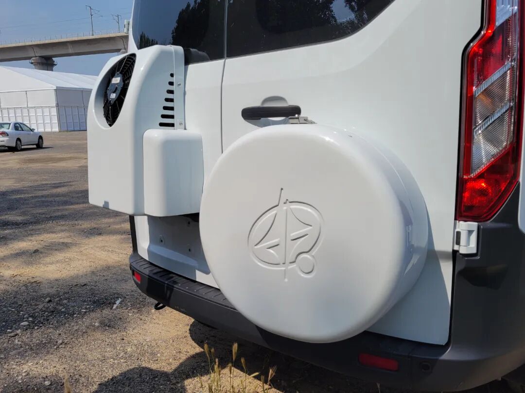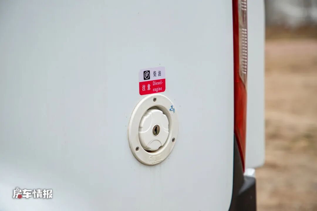 外观上,除了基础的手动遮阳棚,在车尾部还加入了一个看似是外置备胎,实际却是一个外置燃油灶的设计,这样也能满足一些日常在外部的生活需求,而且又因为这辆车是汽油车,所以在车身左侧还加入了柴油加注口的设计,也是为了方便柴油灶的使用。