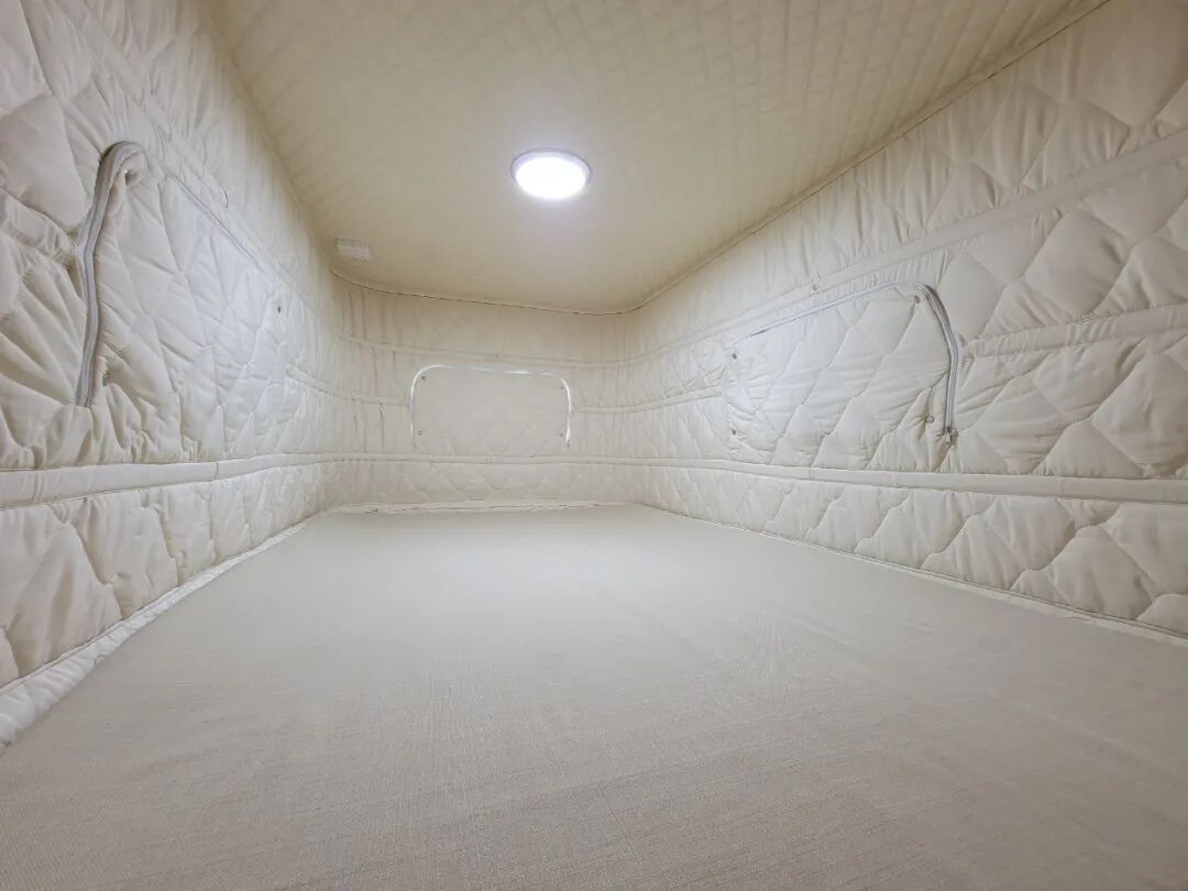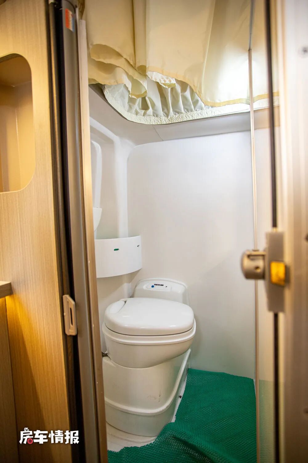 除了基础的睡床功能,这款车还多了一个GL8不具备的功能,就是独立的卫浴室,就位于车厢最尾处,虽然说整体的空间不是很大,但是打开升顶,拉起软帘,也能简单的淋浴和上厕所,满足日常出行的基础洗漱需求。