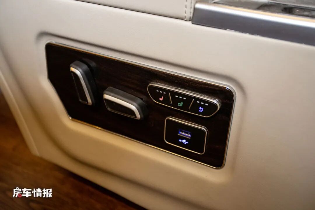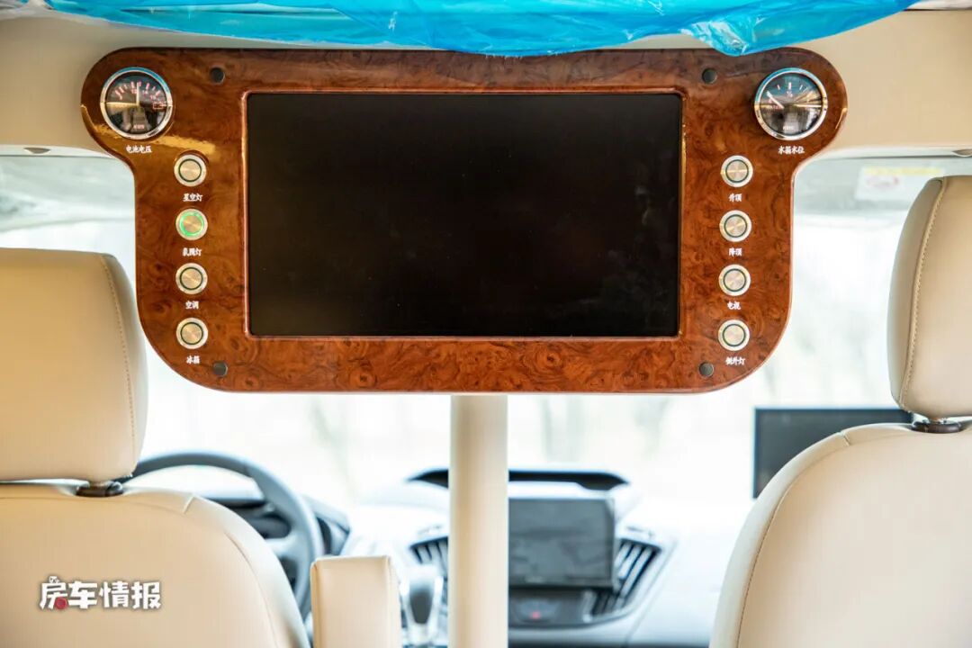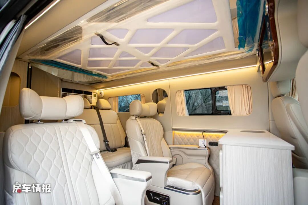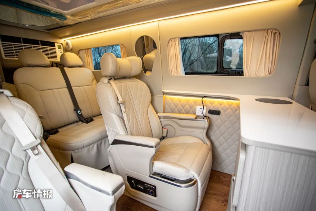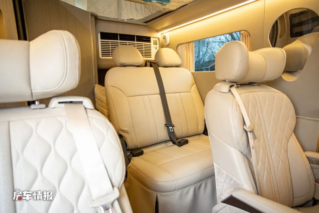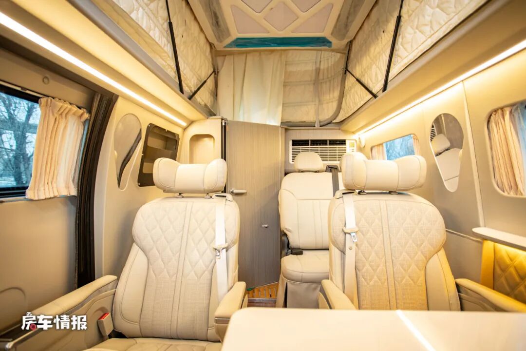 进入车内,区别于平时我们常见的B型房车,这辆车看不见固定的床铺,而是在空间有限的车厢内提供了两张独立的航空座椅,带有腿托、加热、通风和按摩的功能,舒适性完全超过乘用车的座椅,而且车内采用了软包的墙饰,顶部还加入了设计感的顶灯,也为整辆车注入了更多豪华的感觉。
